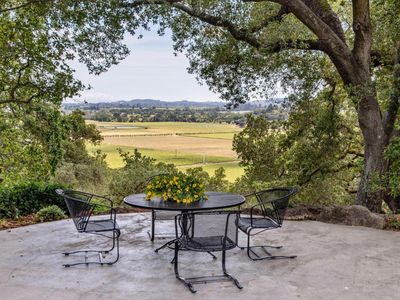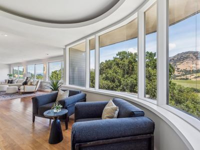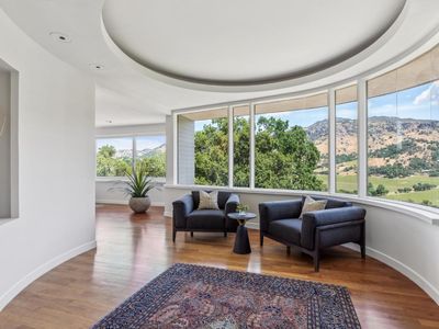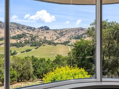The incredible legacy of this estate will capture your imagination, while the beauty of the setting and the style and comfort of the home will capture your heart. Perched atop a knoll and anchored in bedrock, this 7,912 SF, 6-bedroom home commands views of Napa Valley with Stags Leap Palisades as the backdrop. Designed to take in the ever-changing light on the peaks, the home blends strength and artistry with restrained elegance. The glass-paneled doors open to amber wood floors and a gallery of windows. The warm bookshelf lined library is tucked down the hall, while the living room with open beams, stone fireplace, built-ins and hidden glass doors that partition it from the window gallery, then flows seamlessly to the bar & dining room with gorgeous views. The chef's kitchen features butcher block counters, a six-burner Wolf range, skylight, and is open to the family room. The west-facing primary suite offers a marble bath, deep soaking tub, and spacious dressing room. The lower level includes a former dance studio, additional bed & bath, woodworking shop, wine cellar, and guest suite with its own outside patio. Upstairs, three charming bedrooms feel like a secret retreat. Surrounded by gardens, and heritage oaks this 8.19 acres is history waiting to be loved and reimagined.