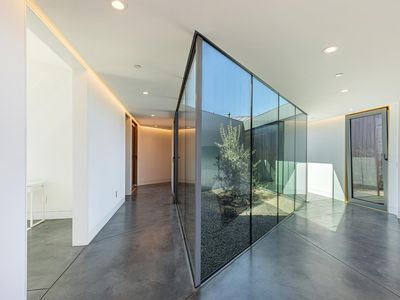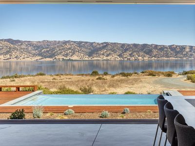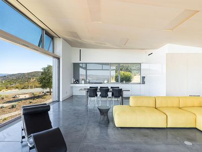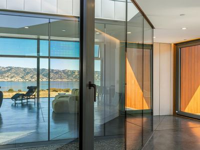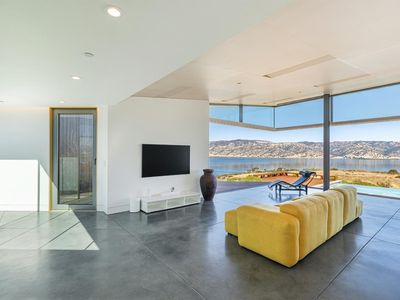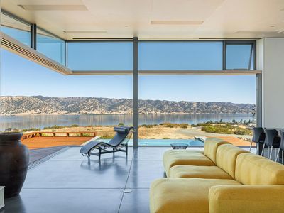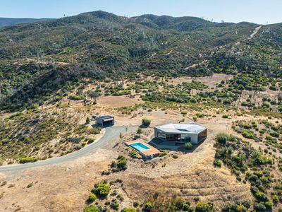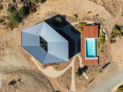 The Berryessa Lake House is a breathtaking fusion of architectural innovation and engineering precision. Situated on 95 acres in Napa County, this award-winning, IwamotoScott-designed residence is a steel & glass marvel offering panoramic views of Lake Berryessa & the surrounding valley landscape. The home's bold hexagonal design and cantilevered concrete foundation appear to hover above the natural terrain. Massive European glass doors slide seamlessly into wall pockets, opening the living area to the outdoors. While the exterior boasts a dramatic silhouette, the interior is thoughtfully designed with rectangular living areas, prioritizing comfort and functionality. The home includes three bedrooms, an office, two full baths, and a dramatic great room surrounding a central glass courtyard, a serene focal point that brings natural light deep into the home. The detached garage, with aircraft hangar doors, serves as the command center for the property's infrastructure. Designed to be fully self-sufficient with its own solar energy system, spring-fed water supply and commercial generator. The vast acreage offers several potential building sites for expansion. This one-of-a-kind property is ideal for a discerning buyer seeking privacy, sustainability, and impeccable modern design.