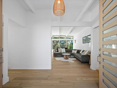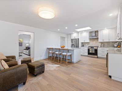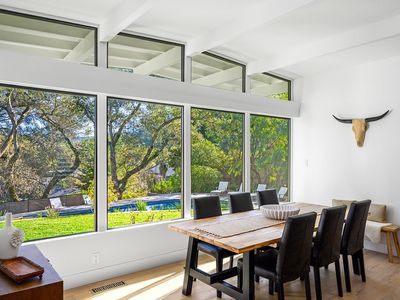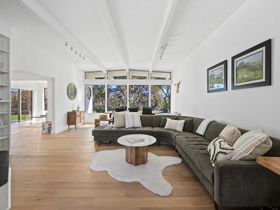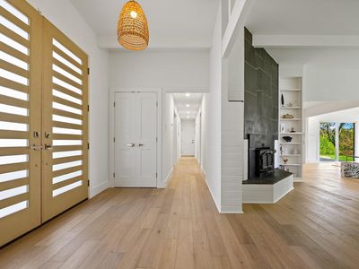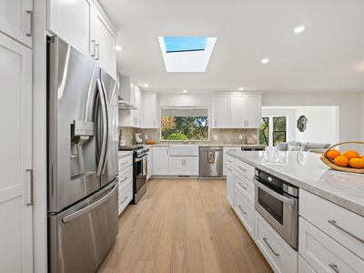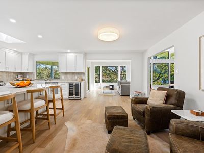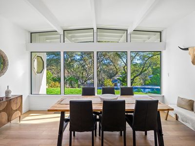 Stunning single-story home on an incredible lot with privacy and views in downtown Healdsburg. Renovated in 2025, this high-end Mid-Century style home has designer touches, boasts 4 generous bedrooms, plenty of space for gathering and entertaining, a fabulous pool and sits on a .45-acre parcel. Tucked back off University, the sun filled flag lot has mature landscaping and views to Fitch Mountain and beyond. Inside you will be delighted by the brand-new kitchen with stainless steel appliances, wine fridge, wide plank French Oak floors, gorgeous Taj Mahal quartzite countertops and an oversized peninsula with bar seating and storage. The kitchen space is expansive with great workspace and includes a breakfast area. Off the kitchen there is an additional space, filled with windows that would make a great light filled reading nook or sunroom and has a sliding door that provides access to the outdoor patio. The great room consists of the living room with a wood burning fireplace connecting with the dining area that offers views to the pool. Enter the primary suite with a sliding door that opens to a patio with views and a luxurious bathroom with soaking tub and walk in shower. In addition, there are 3 spacious bedrooms, one with a built-in desk and another full bath with double sinks and a powder room off the laundry room. The laundry room, with new washer and dryer also has a work sink and additional storage and a walk-in pantry. Step outside into the park like backyard and relax, swim, work on a garden or enjoy your detached flex space that is currently staged as a private gym/studio. This rare parcel is set amongst other estate homes and just a few blocks from downtown Healdsburg. For efficiency it has two heat pumps and owned solar. More room to grow so talk to the city about adding a pool house or ADU. An amazing place to call home!