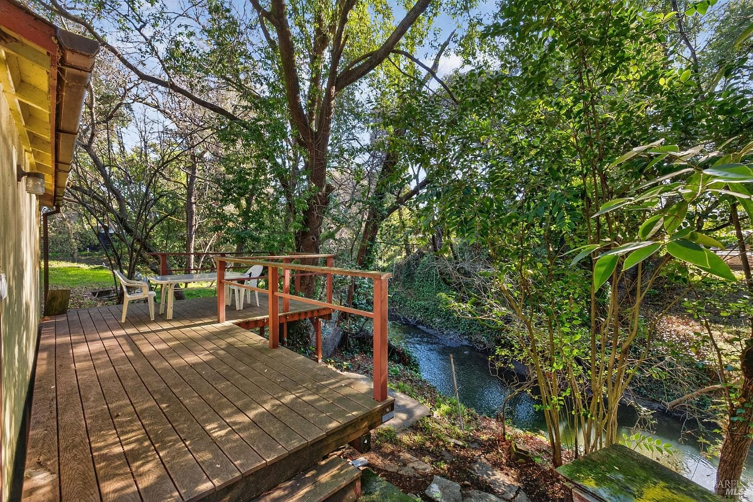 A main home and separate cottage anchor this rare Creekside property with detached garage space and generous parking, set on a private lane at the end of a quiet cul-de-sac just minutes from downtown Santa Rosa. Mature trees frame the property, with the Creekside setting creating a calm, tucked-away feel. The main residence offers two bedrooms and one bathroom, wood floors, a cozy living room with fireplace, and a dining area off the kitchen. A side laundry room and pantry add everyday function, and a large family room with built-in bookcases provides a flexible living space. The home has warmth, character, and clear potential for your own updates. The detached one-bedroom, one-bath granny unit features a comfortable cottage feel and its own sense of charm. A detached garage includes a larger bay door along with an additional one-car garage, offering versatile storage and parking options. Decks overlook the creek, garden beds receive good sun exposure, and the backyard includes lawn space and shaded seating beneath mature trees. This home is on City water but also has a well for gardens and irrigation. Peaceful and private, yet close to downtown Santa Rosa with a variety of dining and shopping. Visit nearby wineries or enjoy a short drive to Bodega Bay. This property offers a rare opportunity to refresh and personalize a truly special setting.