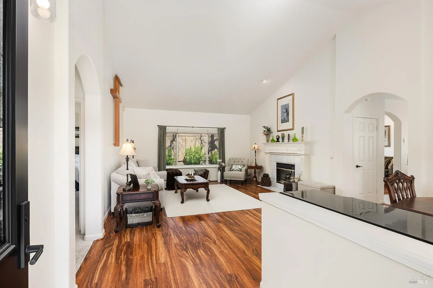 Single Level home on a private court, offering 1,840 sq.ft of comfortable living space. Inside,you will find a spacious living room with vaulted ceilings,cozy two-sided fireplace, perfect for relaxation. The formal dining area flows into an open kitchen with a breakfast nook, making it ideal for both entertaining and daily living. The adjoining family room opens directly to the back patio with its natural grounds that often attract deer and other wildlife, adding to the appeal of the backyard setting enjoyable year-round even from the comfort of your couch. The home's bedrooms, including the expansive primary suite, are situated on one side of the home for maximum privacy. The primary suite features a luxurious bath with a soaking tub and a stand-up shower. The other bedrooms are generously sized, and the laundry room is conveniently located nearby. The hallway bathroom features a walk-in tub with jets and shower attachment. Additional features and recent upgrades include beautiful wood-grain laminate floors; tile kitchen & bathroom floors; updated central heating and AC; a newer roof; all new Anderson Fibrex dual-pane windows & sliding glass doors that foster energy efficiency, exterior sound reduction, and fire hardening protection with Vulcan Fire Vents, fresh ext. paint and lots of built in storage in the garage.