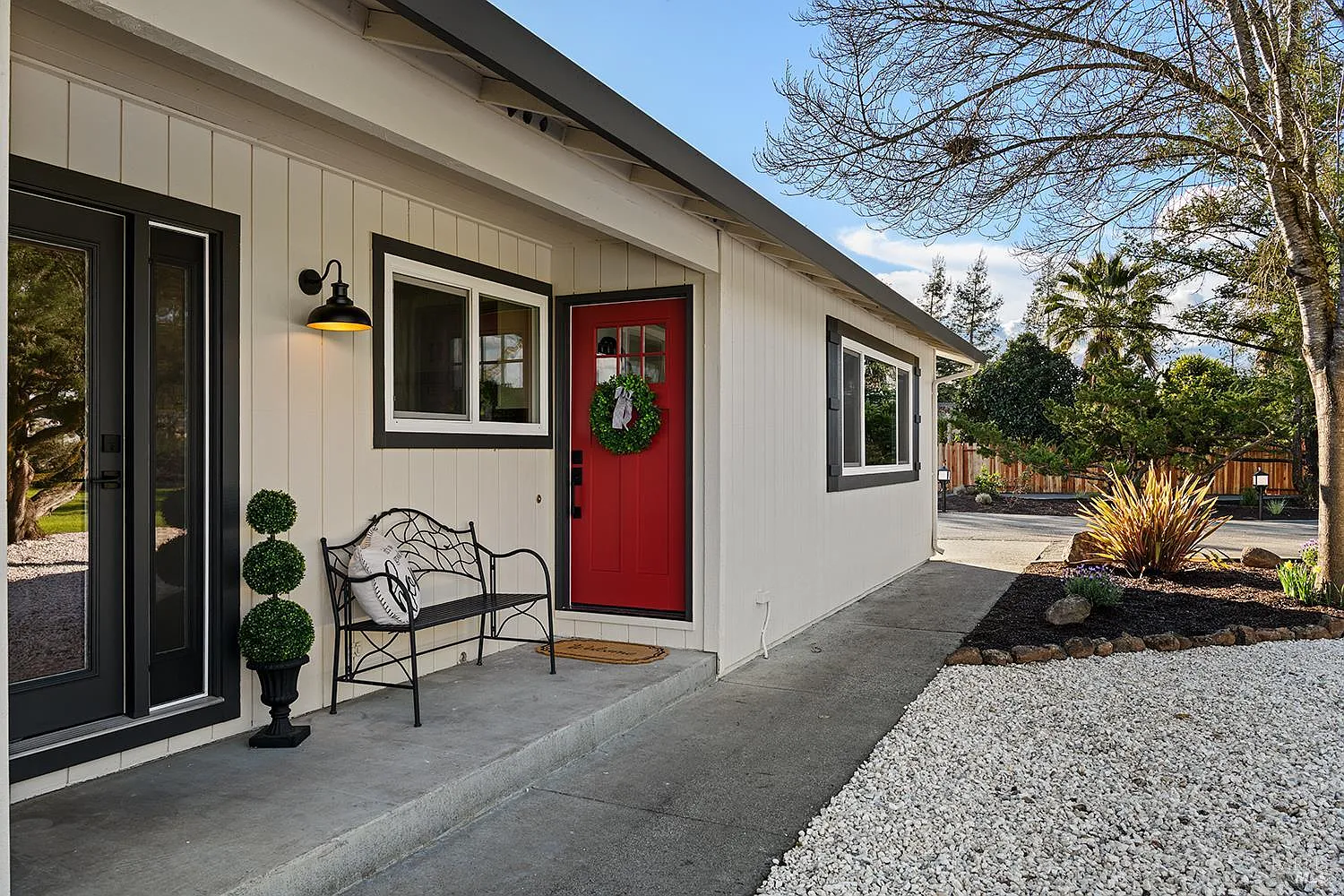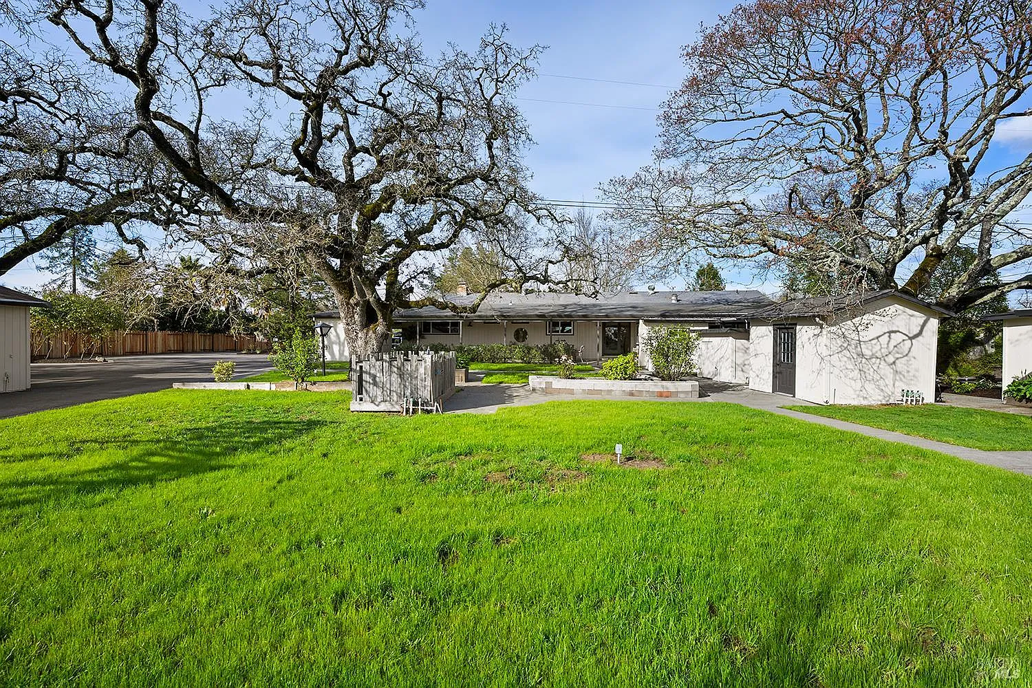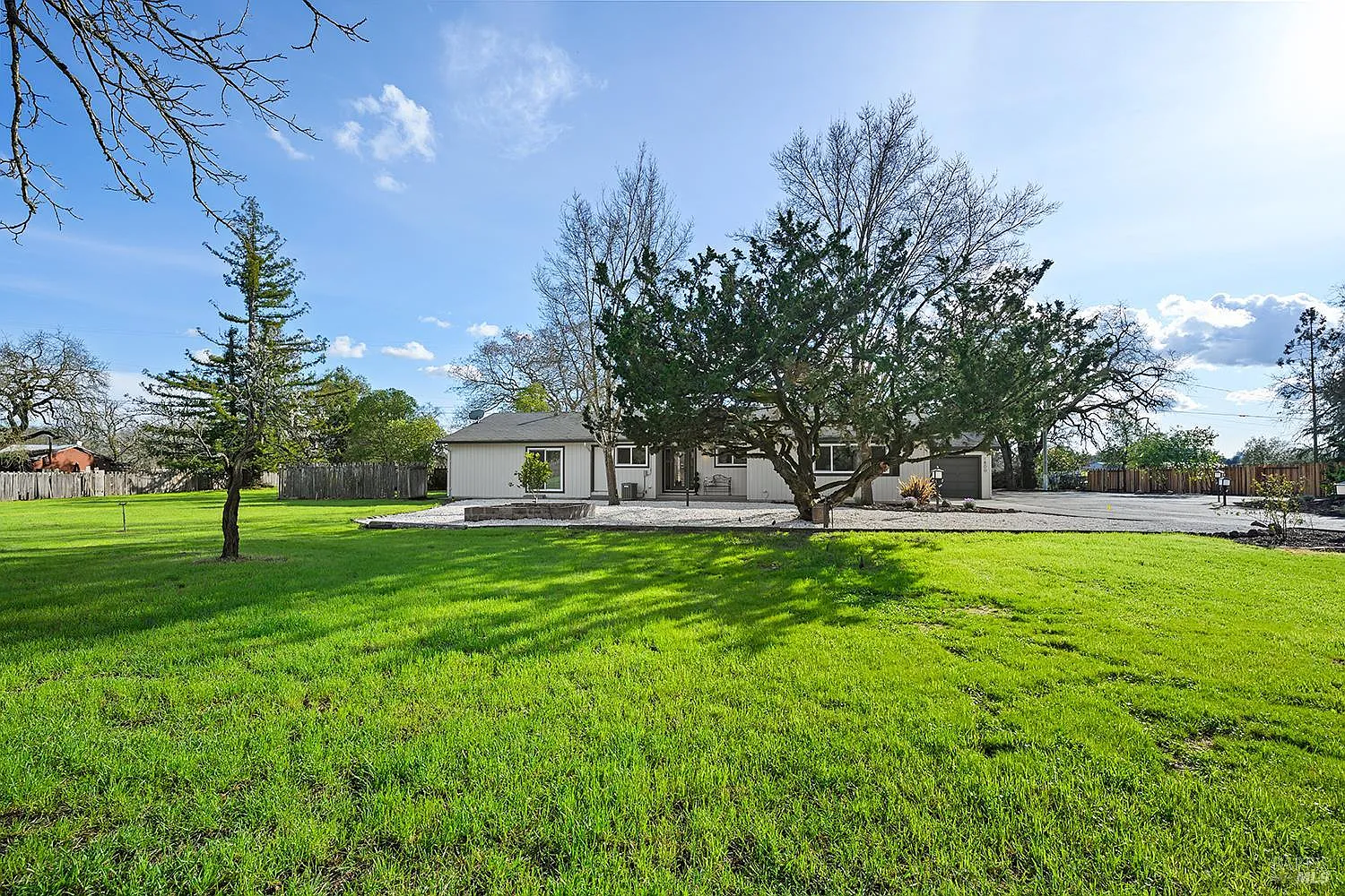 Set up for generational living, this beautifully refreshed sprawling single-story home is located at the end of a quiet country lane on 3.85+/- pristine acres. Set amidst majestic oaks, the main home as set up will accommodate two separate living situations, and then there is a detached finished flex space that can serve as an ideal home office, or could be guest quarters for the occasional visitor. There is a barn perfectly suited for the gentleman farmer, and two additional sizable outbuildings that could serve as car or RV storage, or even just as workshops. Horses, cows, goats or sheep would be happy on this level parcel in the middle of Sonoma County's premier Russian River Wine Country. This is peace and serenity at its finest close to all conveniences.