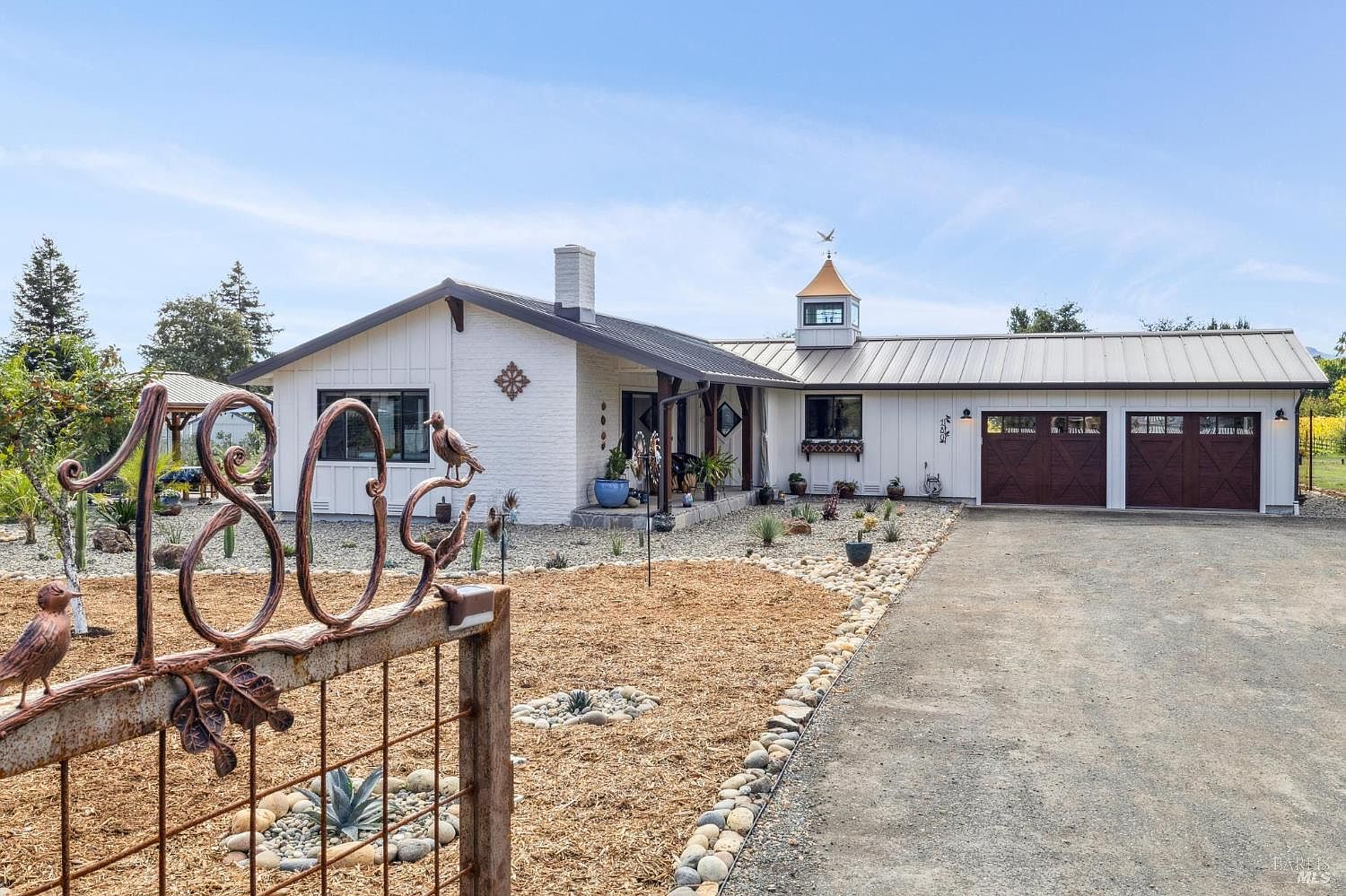 This elevated Wine Country retreat in the heart of Kenwood has been beautifully reimagined with exceptional craftsmanship and refined design. 360 degree VIEWS of Mountains and Hills are the backdrop for this special property. Set on just under 2.5 level acres, the single-level 2,017 sq. ft. home features 2 bedrooms, 2.5 baths, and a versatile flex space with office, pantry, laundry, and a custom dog-washing station. (Could be 3rd Bedroom) The formal living and dining room showcase vaulted ceilings, Valor GE4 Electric Fireplace and abundant natural light, while the open-concept family and kitchen retreat highlights custom cabinetry, Ijun Blue Quartzite surfaces, and top-tier appliances including Sub-Zero, Wolf, and Miele. Artistic touches abound from the handcrafted stained glass Blue Heron by a Sonoma artist to a Copper Weathervane Crowning the Cupola. Every detail has been thoughtfully curated, from designer lighting and automated shades to Hardie fire-resistant siding, metal roofing, and solar with battery backup. Surrounded by graceful olive trees, metal fencing, and beautifully designed landscaping, this is elevated Wine Country living at its finest. Room for a pool AND a large barn with ADU and expansion possibilities.