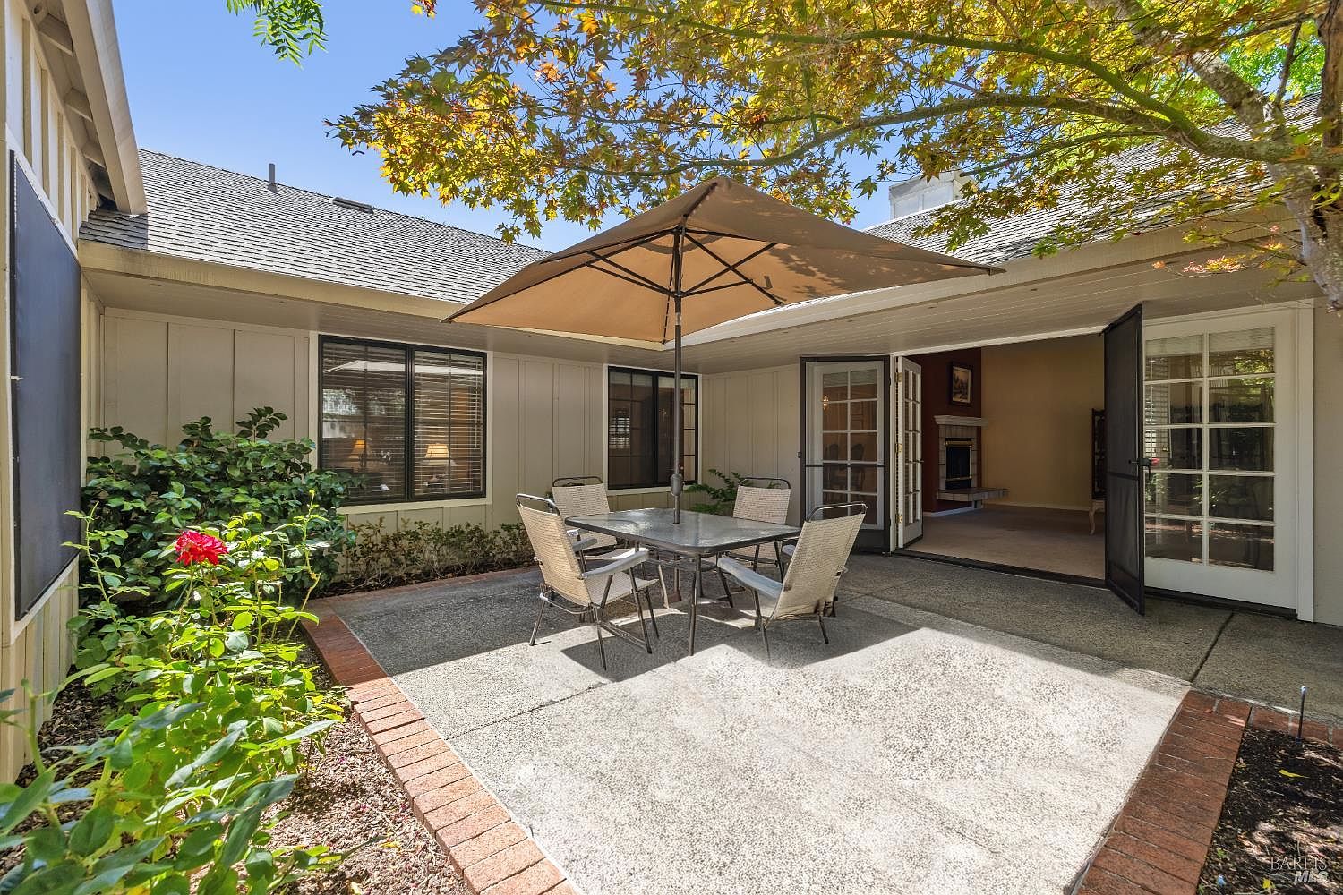 Located in a quiet and sunny spot within a lovely, central Sonoma community. A courtyard entry and a flowing plan welcome you into this single-level residence. Enjoy comfort and indoor/outdoor space. High ceilings enhance 1,900+/- sq. ft. with 3-bedrooms and 2-baths and a layout that flows effortlessly from French doors to two private patios. Spacious dine-in kitchen opens to a rose lined patio. Generous primary suite has a walk-in closet and French doors to a courtyard patio. Convenience includes a full indoor laundry room and interior access from 2-car garage with storage, shelving and room for a workbench. Resort-style amenities here with scenic paths including a picturesque lake, swimming pools and tennis courts. Nearby dining, shopping, schools and transportation, minutes to the Sonoma Plaza. Whether seeking a full-time residence or a weekend escape, this home offers the opportunity to create your own Wine Country retreat.