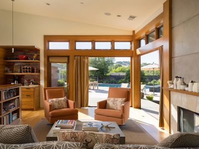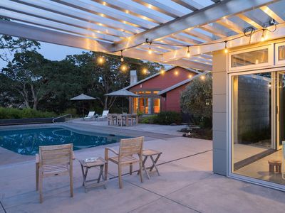 Wine country views from two architecturally refined homes and a glass walled pool house. Perched on a gentle 5.48+- acre knoll just outside the historic town of Glen Ellen. Enjoy seamless indoor-outdoor flow, walls open entirely to the surrounding vistas, creating the feeling of being immersed in Sonoma Valley's picturesque landscape. The main residence centers around a dramatic great room with soaring ceilings, a striking fireplace and expansive glass framing the valley and hillsides. The chef's kitchen features premium appliances and an effortless connection to living and dining areas and the wine cellar for both intimate evenings and grand entertaining. Multiple terraces and patios lead to the sparkling pool, pool house and outdoor lounging areas all oriented to capture the view. Light-filled second dwelling sits privately apart, complete with a covered porch, bocce court and gardens. Mature oaks, groomed paths and established landscaping enhance the tranquil, resort-like setting. Minutes to historic towns, renowned wineries, parks and just 1+ hour to San Francisco.