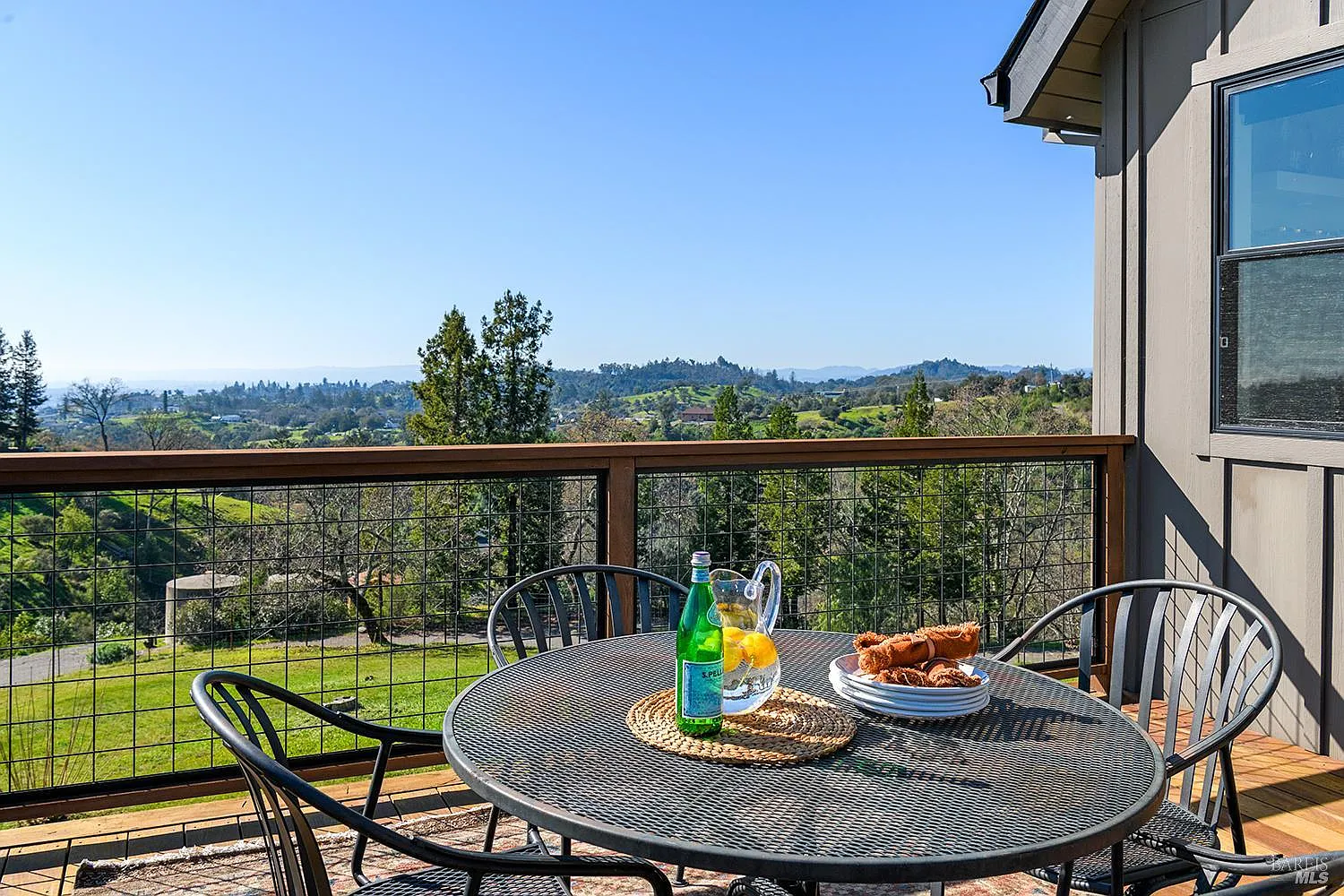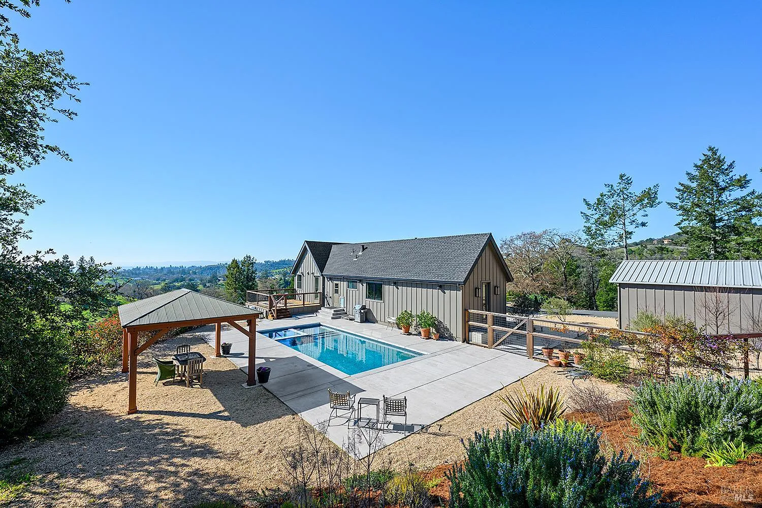 Discover a knolltop sanctuary offering sweeping vistas, single-level living, and exceptional privacy. Built in 2021, this beautifully designed 3-bedroom, 2-bath residence with pool is set on over two fully fenced and gated acres. Bathed in natural light from its southern exposure, the open layout showcases luxury finishes throughout, including expansive wood flooring, floor-to-ceiling fireplaces, natural stone, and a stunning kitchen with Wolf and Sub-Zero appliances. The home flows seamlessly to outdoor living spaces where panoramic views frame a resort-style pool and spa. The property features fruit trees, raised garden beds, room for expansion, and an expansive 4-car garage offering flexible space for a workshop, gym, or... Located in a peaceful neighborhood just minutes from everyday conveniences and wine-country destinations, this serene retreat is ideal for full-time or part-time living.