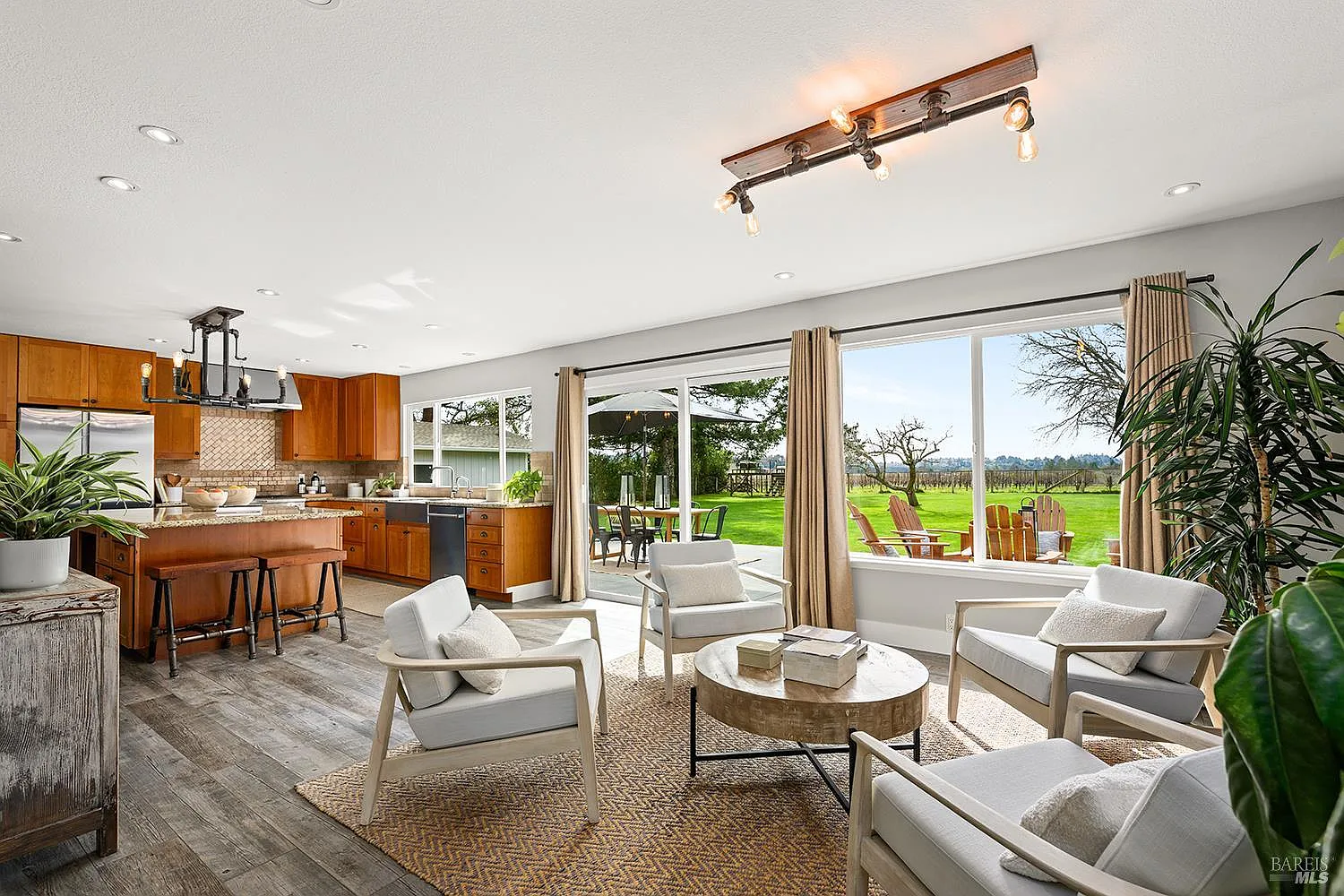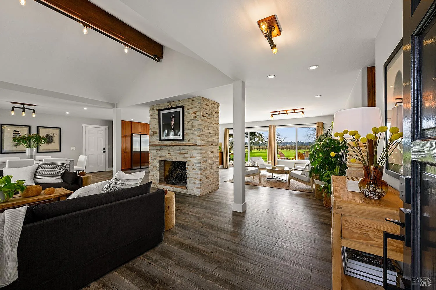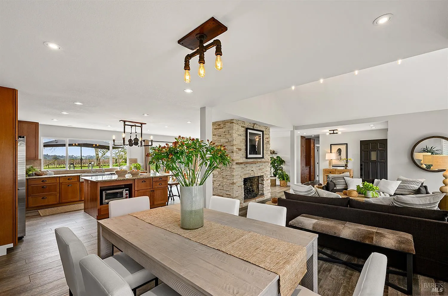Don't miss this stunning tastefully reimagined single-story 3 bedroom, 2 bathroom, 1774+/- sq.ft. home. Located along the top of a ridge on .80+/- level view acres in the sought-after hills of Western Sonoma Wine Country, this beautiful home with an open floorplan and soaring ceilings boasts rich wood cabinetry, glistening stone slab countertops, stainless appliances and an island making it the perfect kitchen for entertaining on a grand scale. There is a warm and cozy fireplace surrounded by attractive ledgestone and stunning tile flooring throughout. Recently remodeled bathrooms boast attractive stone and tile finishes, and designer lighting and hardware. Walls of glass along the back of the home frame a vast lawn with a spectacular vineyard backdrop and breathtaking views out over the vines to distant forested hills. A sizeable detached outbuilding with a bathroom is the perfect flex space suitable as a gym, home office or guest quarters. An additional oversized detached garage is the perfect shop, and the built-in outdoor kitchen is sun protected under an attractive gazebo. Enjoy all this just minutes from colorful downtown Sebastopol with the thriving Barlow outdoor market, the Rialto theatre, wine and beer establishments and artisan shops. This is Wine Country at its finest.