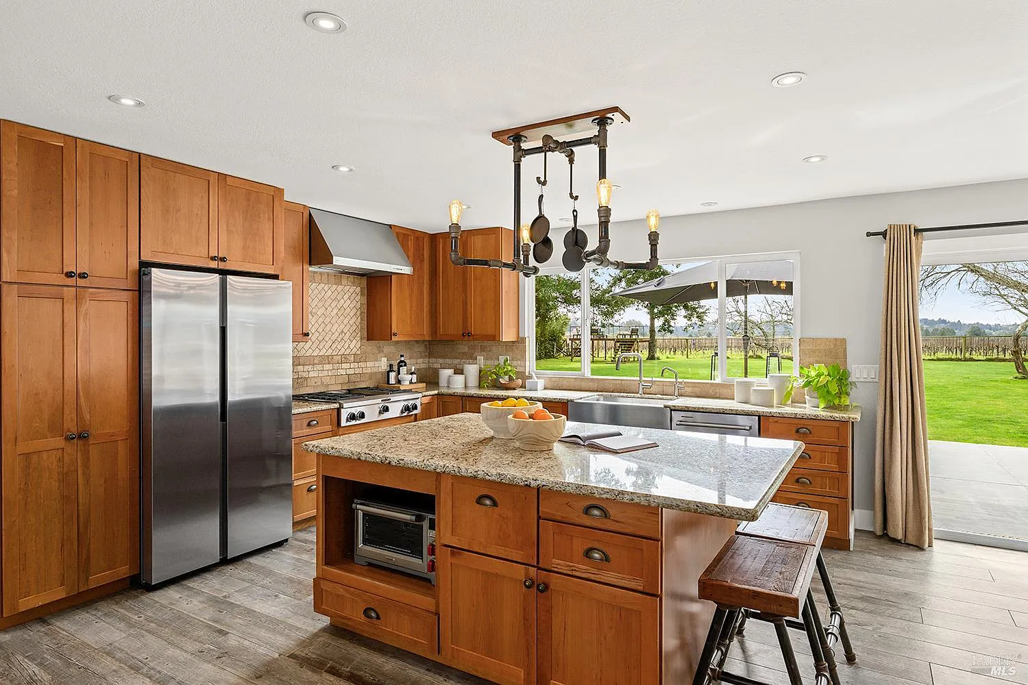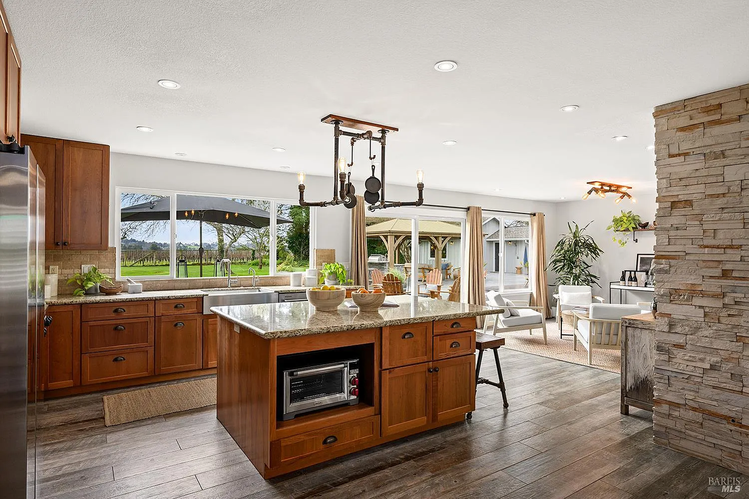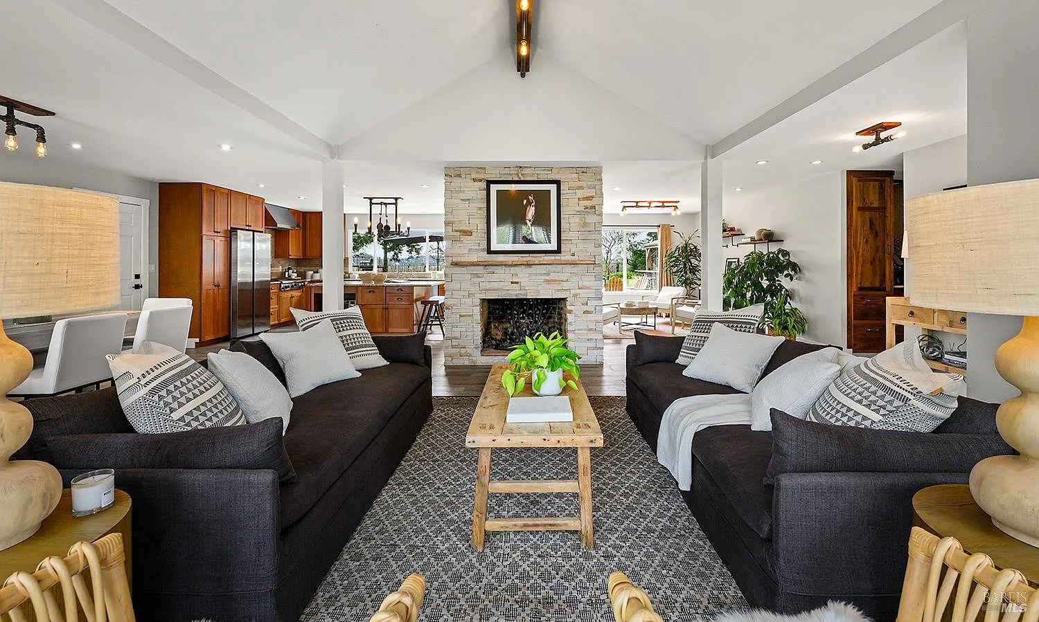Don't miss this stunning tastefully reimagined single-story 3 bedroom, 2 bathroom, 1774+/- sq.ft. home. Located along the top of a ridge on .80+/- level view acres in the sought-after hills of Western Sonoma Wine Country, this beautiful home with an open floorplan and soaring ceilings boasts rich wood cabinetry, glistening stone slab countertops, stainless appliances and an island making it the perfect kitchen for entertaining on a grand scale. There is a warm and cozy fireplace surrounded by attractive ledgestone and stunning tile flooring throughout. Recently remodeled bathrooms boast attractive stone and tile finishes, and designer lighting and hardware. Walls of glass along the back of the home frame a vast lawn with a spectacular vineyard backdrop and breathtaking views out over the vines to distant forested hills. A sizeable detached outbuilding with a bathroom is the perfect flex space suitable as a gym, home office or guest quarters. An additional oversized detached garage is the perfect shop, and the built-in outdoor kitchen is sun protected under an attractive gazebo. Enjoy all this just minutes from colorful downtown Sebastopol with the thriving Barlow outdoor market, the Rialto theatre, wine and beer establishments and artisan shops. This is Wine Country at its finest.