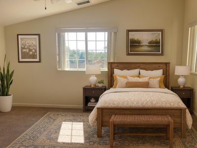 Beautiful large Mediterranean style home on over a 1/2 acre on quiet street with no neighbors behind. Incredible views from most rooms. Built-in office on main floor, built in bookcases upstairs for a nice reading nook! Enjoy the beautiful solar heated pool or bar-be-que on the covered patio in the back! House has generator on demand! Two master suites, one on each floor! A must see! Like a huge garage? This one is extra deep, too!