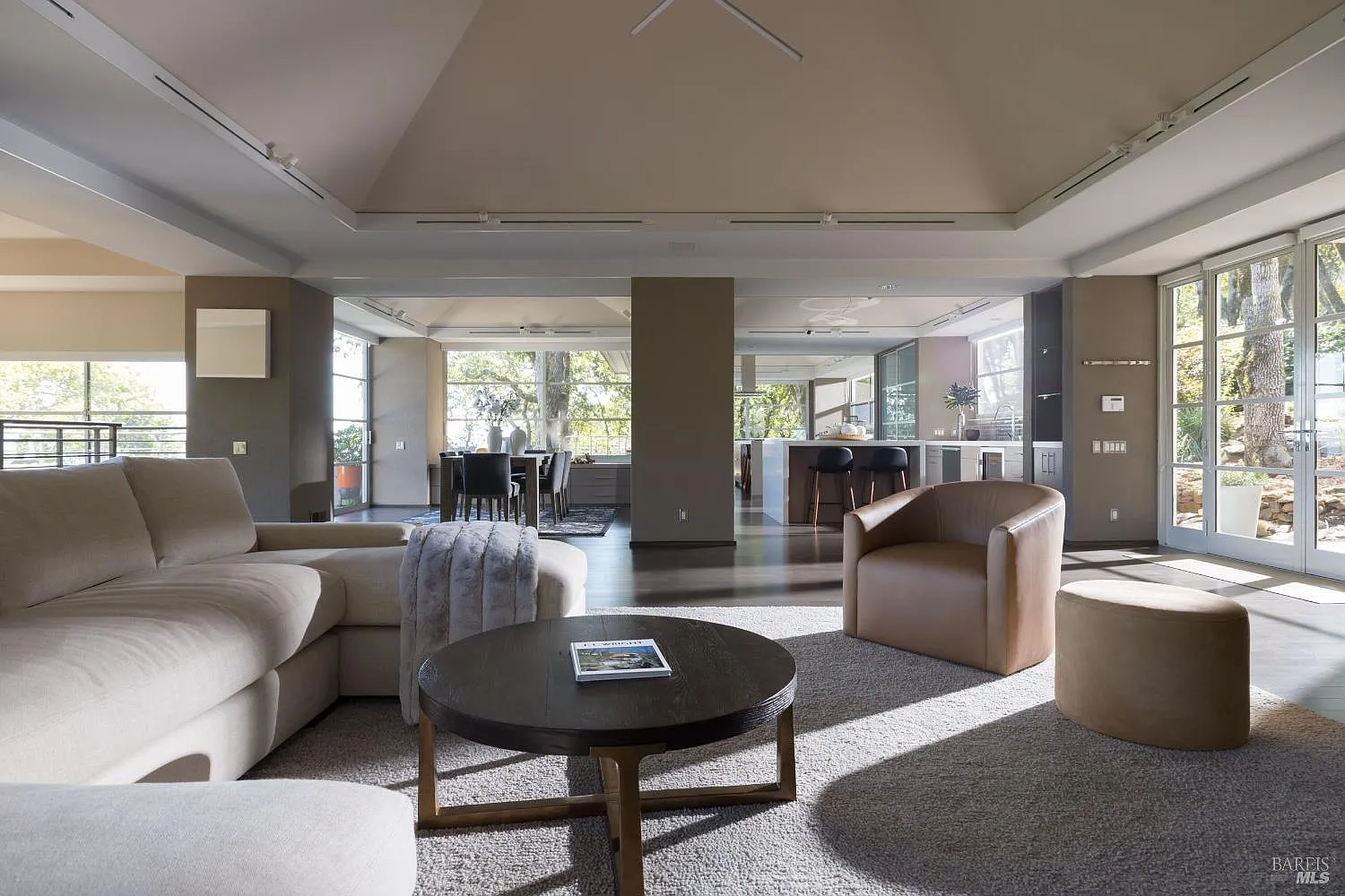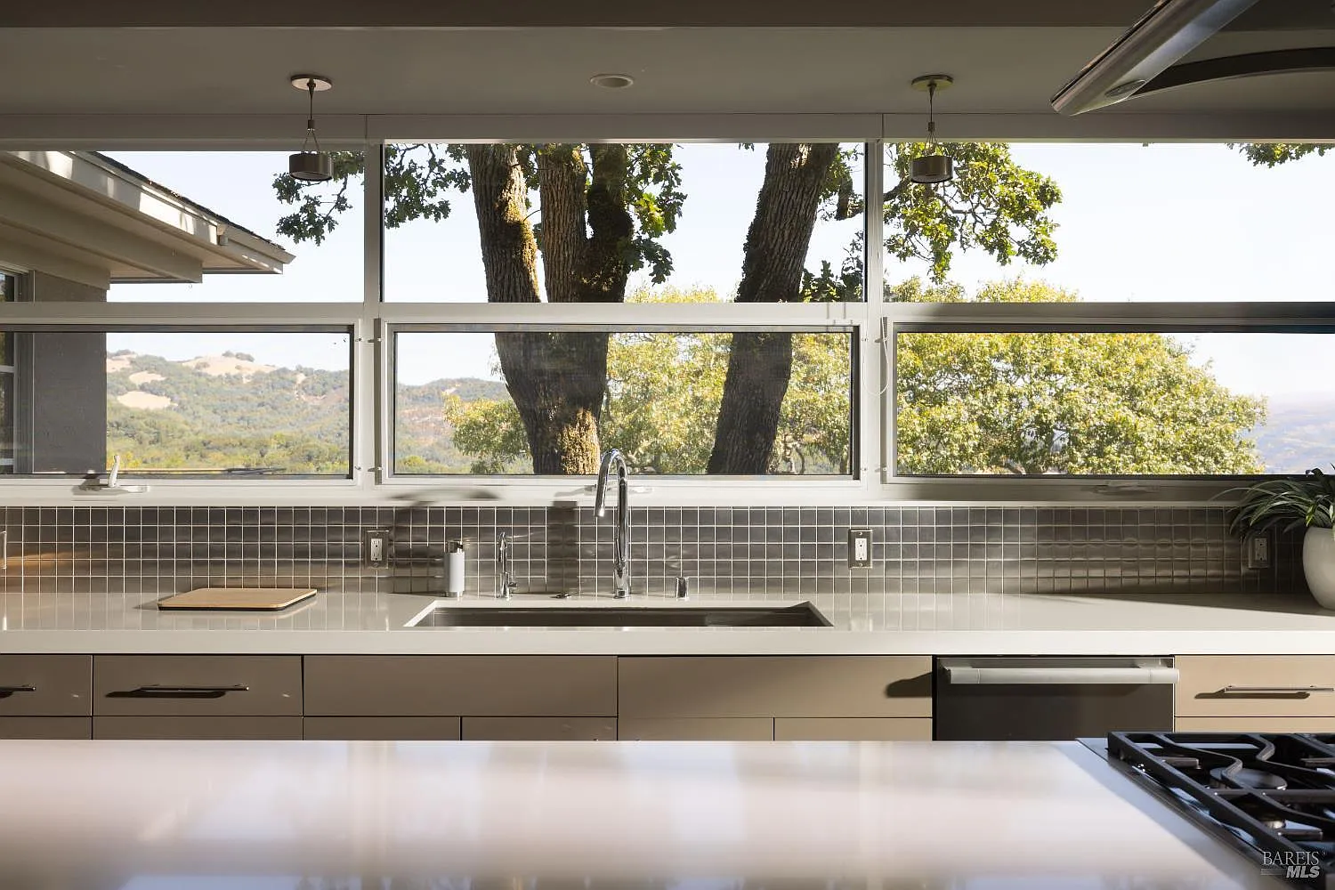 Now offered fully furnished, this award-winning contemporary residence was designed by architect J.R. Smith to intentionally unfold along the northern slope of Sonoma's George Ranch. Approached via a wide stone staircase and marked by an entrance constructed of aluminum and double-glazed doors, the interior features walls of glass and awe-inspiring views. Sophisticated, multi-level and decidedly adult, this is a home that is both perfect for quiet contemplation as well as grand gatherings. The main level has an expansive living area with breathtaking views across the valley. The sleek kitchen features dual islands and premium appliances. Just beyond glass doors at the edge of the kitchen, an outdoor dining area with built-in grill and fire pit await. Back inside, the formal dining area offers its own balcony overlooking the pool below. As if stepping down through the trees and resting comfortably on its site, the primary suite offers a sitting area, custom walk-in closet and spa-like bath. Nearby, a library with terrace of its own provides a quiet workspace. Traverse past the turquoise plunge pool to the detached guest space w/sitting room and two en suite bedrooms. Built for those that appreciate distinctive architecture, privacy and the luxury of owning a secluded hillside retreat in Sonoma wine country. Begin enjoying your new home from the moment you receive the keys.