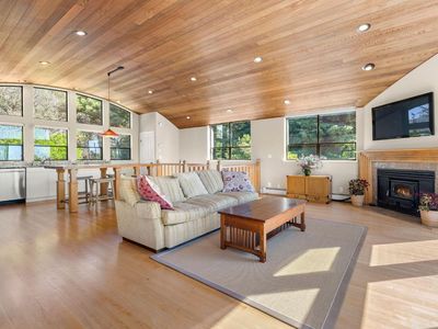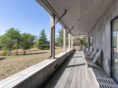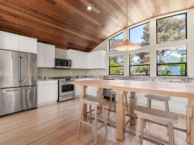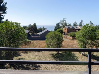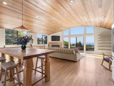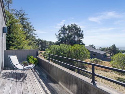 Derived from the rugged beauty presented by The Sea Ranch hillside, this two-bedroom, two-and-a-half-bathroom residence is thoughtfully designed to showcase sweeping Pacific Ocean views through a modern interpretation of classic farmhouse architecture. Featuring a contemporary reverse floor plan, the elevated second story offers an open-concept living, dining, and entertaining space beneath a striking wine-barrel ceilingcreating a warm, welcoming ambiance framed by the ever-changing landscape of Northern Sonoma's coastal skyline. With its proximity to world-class hiking trails and dense redwood forests, this home truly offers the wonders of nature at your very fingertips. Purposefully envisioned for its hillside setting, the home features a covered deck and walkway leading to a two-car garage, offering protection from the coastal elements. With two en-suite bedrooms located on the lower level, the floor plan ensures a balance of private retreat and everyday livability. Expansive sliding glass doors offer separate entrances and foster a seamless connection to the surrounding natural environment.
