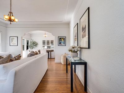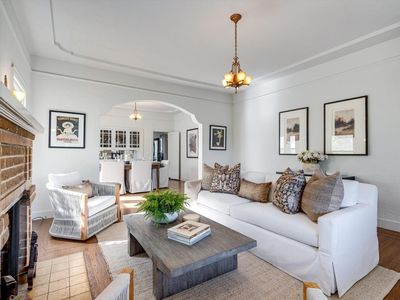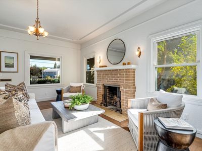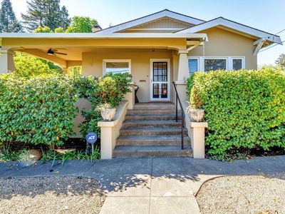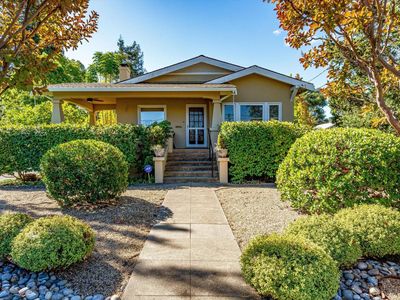 Charming 1940s in-town bungalow on a spacious double lot! This delightful home showcases all the classic features of the era coved ceilings, original light fixtures, rich hardwood floors, and abundant built-ins along with a full basement offering ample storage. The home includes two bedrooms, one bath, and a versatile breakfast room or office that enhances its livability and charm. Outside, a detached two-car-plus garage anchors the rear of the property, while an abundance of mature fruit trees dot the oversized city lot, creating a private and inviting outdoor retreat.