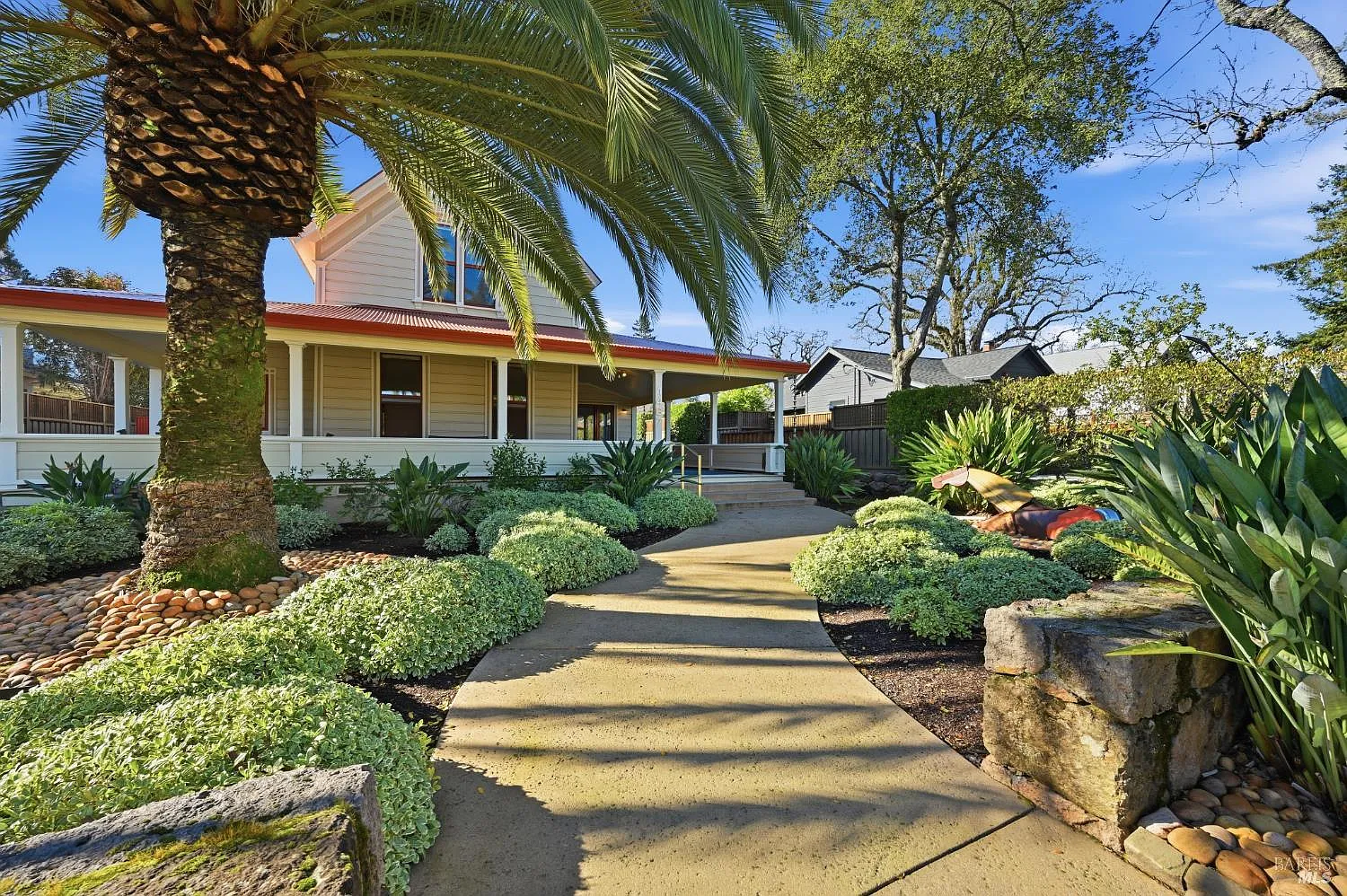 Only two blocks from St.Helena's Main Street, on a rare oversized lot, is a gracious historic home and barn, thoughtfully remodeled in 2005. Reimagined with a contemporary sensibility, inviting outdoor living spaces that feel both timeless and effortlessly current. The property offers an opportunity to experience the pinnacle of turn-key living in the most desirable neighborhood of Napa Valley. 1467 Kearney Street, blends modern luxury with wine country charm. The open-concept living, dining, and family areas flow effortlessly through the tall glass doors to a covered porch, expansive terraces, guest house and the ultimate entertainer's dream barn. Perfect for indoor-outdoor enjoyment. The main kitchen features a Wolf range, double oven , subzero refrigerator, stainless steel appliances, and a spacious pantry with generous storage. Hardwood floors, specialty tile, and marble run throughout, adding warmth and sophistication. A serene primary suite with en-suite bathroom, walk-in closet and designated office, all conveniently located on the main level of the residence . Two light-filled bedrooms, great closets and an additional full bath are located on the upper level. Views of the valley and hills can be enjoyed out every window and door. Across the courtyard is a detached, newly constructed guest house offering stylish, flexible space for hosting or extended family. An exceptional offering, uniquely positioned on one of the very few drive-through lots in St.Helena.