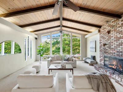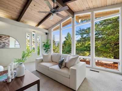 Stunning Views! This mid-century modern-ranch style home offers large floor to ceiling windows with picturesque views of Mt. St. Helena. Warm and inviting living spaces including vaulted ceilings with open beams and skylights. Mature landscaping, native oaks, manzanillas, and outdoor spaces including a 120SF detached office space/art studio for working remotely or for creativity. The terraced backyard with stonework hand laid by local artisan masons leads to a stunning viewpoint on a newer deck with more breathtaking mountain views of the Palisades Mountain range and Mt. St Helena-perfect for morning coffee or evening wine. The primary suite offers a tranquil retreat, walk in closet and a newly updated bathroom. A total of 3 bedroom PLUS an office or den provides flexibility for guests or working from home. Just a short walk to downtown Calistoga's restaurants, tasting rooms, shops, and spas, as well as the newly constructed Vine Trail that connect Calistoga to the rest of the valley. 304 High Street is the ideal getaway or forever home.
