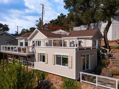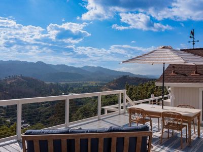 Perched above the valley floor with sweeping vistas stretching from St. Helena toward Calistoga, this exquisitely renovated hillside sanctuary offers the perfect blend of luxury, comfort, and conveniencejust moments from the charm of Main Street, St. Helena. Designed for both full-time living and weekend escapes, this home features two elegant en suite bedrooms, and an additional bedroom with a private bath, plus a stylish office space. Wide-plank French oak floors and soaring vaulted ceilings create an open, airy ambiance, while a cozy fireplace in the living room invites you to unwind in style. Throughout the home, custom-curated Designers Guild window treatments and wallpaper infuse a sophisticated, modern flair. Step outside to the expansive west-facing decks, which provide the perfect setting for sunset gatherings, al fresco dining, or simply soaking in the stunning scenery. A detached yoga studio/office offers a tranquil escape for work, creativity, or mindful relaxation. A spacious storage building and a two-car carport at street level complete the home. ​
