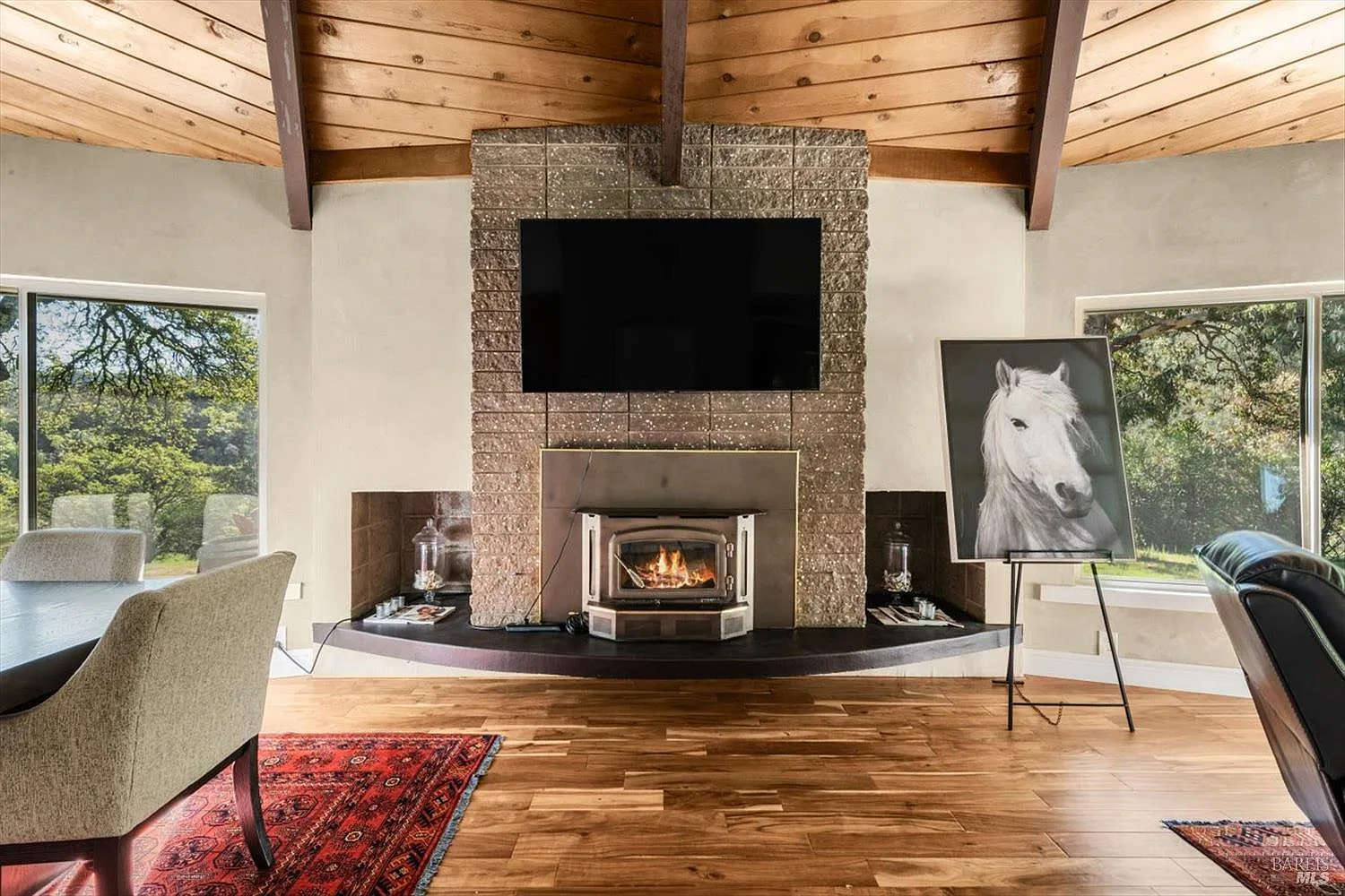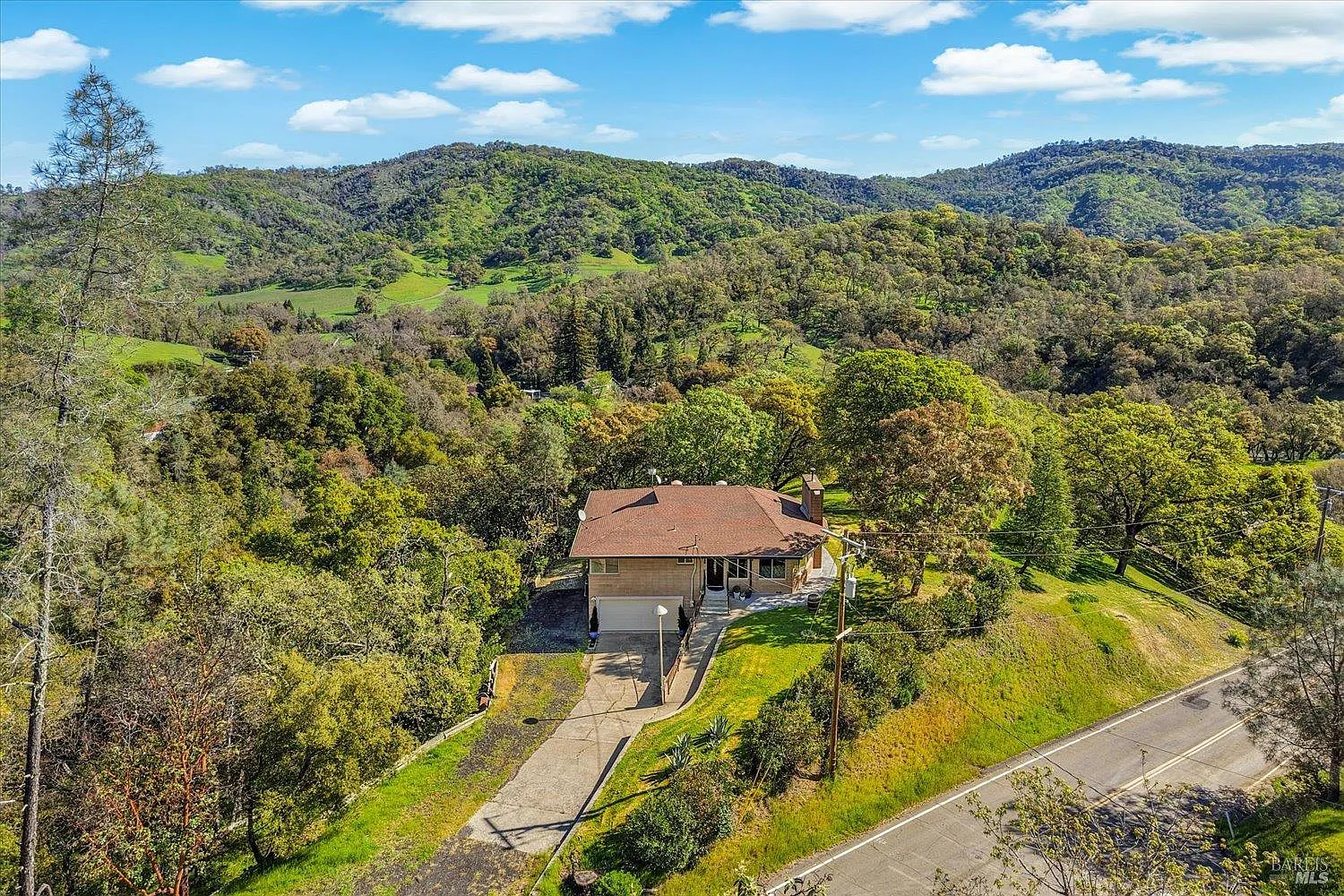 Located in the hillside community of Circle Oaks, established in 1964, this distinctive home is widely regarded as one of the earliest residences built in the neighborhood. Constructed in 1967 and uniquely built of cement block, the property reflects mid-century architectural inspiration influenced by the organic design philosophy popularized by Frank Lloyd Wright. Inside, wood-beam ceilings and expansive picture windows fill the home with natural light and frame the surrounding hillsides. The main living area offers an open circular flow between living, dining, and kitchen spaces centered around a striking fireplace. The flexible floor plan includes three bedrooms and one bath upstairs, with an additional bedroom and full bath downstairs featuring a separate entranceideal for guests, extended family, or home office use. Set on a peaceful hillside parcel with a spacious deck, natural landscape, and ample RV or boat parking, the property offers privacy and character while remaining within reach of Napa's amenities.