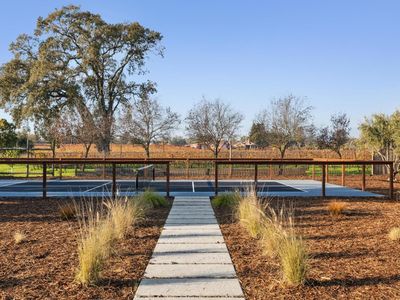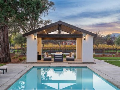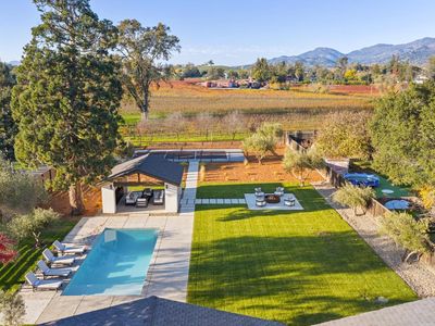 Exceptional Napa Valley lifestyle property located on desirable East Side featuring 5 BR 4 BA modern residence with 3324 +/-sq ft of refined living space on .55 acre with resort-like grounds & stunning vineyard & mountain views minutes to downtown Napa & Yountville. Completed in 2025 extensively renovated & rebuilt, this luxury residence embodies Wine Country living with outdoor features including 14' x 32' pool, 20' x 20' pavilion with shiplap ceilings & recessed lighting, built-in copper firepit with seating area, fenced-in pickleball court & mature imported olive trees - creating an extraordinary Napa Valley retreat. Designed for seamless indoor-outdoor living, great room with retractable doors transitions to spacious lanai with outdoor seating & dining area. Gourmet kitchen curated with custom White Oak inset cabinetry, marble countertops, premium Thermador appliances & spacious center island with seating opens to dining room featuring custom built-in bar with 2 Zephyr wine coolers & living room with electric fireplace both spaces enhanced by vaulted exposed wood beam ceilings. 5 BRs feature 3 ensuites with 2 large upper-level main ensuites, each with vaulted exposed wood beam ceilings, large walk-in closets & private balconies capturing extraordinary views! 3 BRs located on main level adjacent to 2 full baths. Wide plank White Oak flooring, luxury lighting, Signature Hardware & level 5 smooth walls throughout elevate the entire home. Fantastic location walking distance to Silverado Resort & Spa featuring golf, tennis & dining including market/bakery with Starbucks!