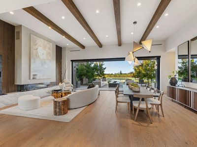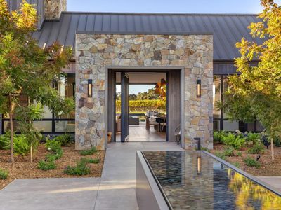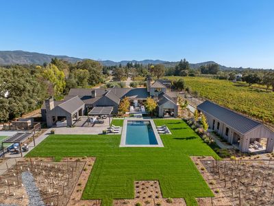 Set on five private acres at the end of a long gated drive, this newly constructed Napa Valley compound redefines modern wine country living. Collaboratively envisioned by architect Alan Page and Bette Abbott Interior Design and completed in October 2025 by renowned builder Vine Homes. The grounds encompass an impressive main residence with two attached garages, two guest houses, and two separate garages - one designed for the avid car collector or the ideal entertainment barn. Designed for grand-scale entertaining and relaxed wine country living, the expansive interiors open to a series of outdoor spaces that celebrate the region's signature indoor-outdoor lifestyle. Recreational amenities include a pickleball court, bocce court, fitness area, pool and spa, a covered pool lounge with an outdoor kitchen and bar, and a private trail that extends around the perimeter of the property. 1.5 acres of Cabernet Sauvignon vines and raised culinary gardens. An iconic residence of rare craftsmanship and vision, where every line, finish, and proportion reflects an unwavering commitment to design, quality, and technology. High-speed fiber optic internet, radiant floors, zoned AC, outdoor heaters, and warm floors in the covered patios and loggias.