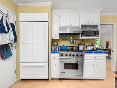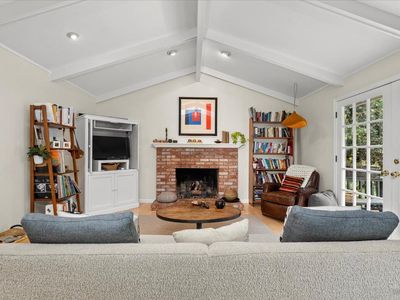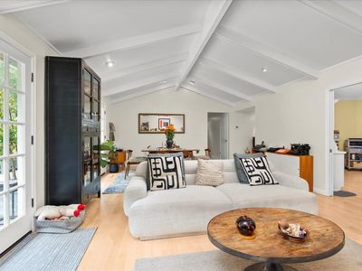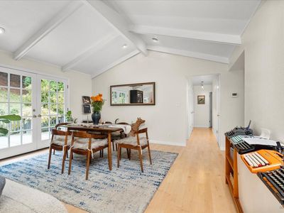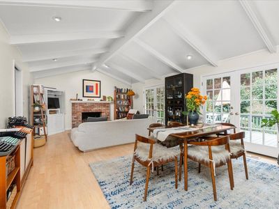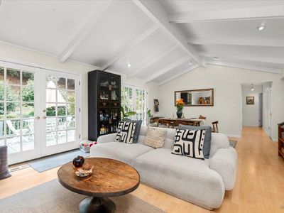 Welcome to a private, serene oasis in sought-after Hidden Valley Estates. Tucked away on a picturesque, highly desired street and set against a peaceful forest backdrop, this beautifully renovated single-level home offers exceptional privacy, tranquility, and timeless appeal. The residence features 1,441 sq ft, 3 bedrooms, and 2 bathrooms, beginning with a light-filled living room showcasing open-beam ceilings, wood floors, and a cozy gas fireplace. A formal dining room with French doors opens to a private deck, creating seamless indoor-outdoor living surrounded by lush gardens, a BBQ area, and a tranquil rear yard retreat. The thoughtfully renovated chef's kitchen blends function and style with a buffet, peninsula seating, built-in Sub-Zero refrigerator, Viking gas range, stainless steel appliances, upgraded cabinetry, and artistic tile countertops. The peaceful primary suite offers direct deck access, backyard views, and a renovated en-suite bathroom with a tiled shower. Additional highlights include fresh interior paint, dual-pane windows, an updated roof, and a two-car garage. This home truly lives like a retreat, offering a rare sense of calm while remaining conveniently close to restaurants, shopping, coffee shops, parks, and everyday amenities.