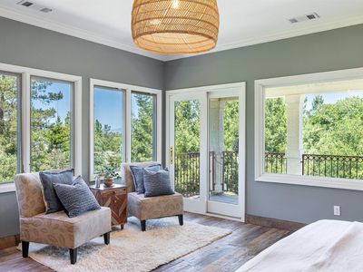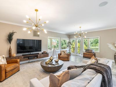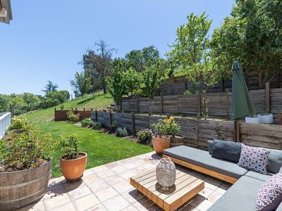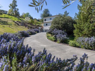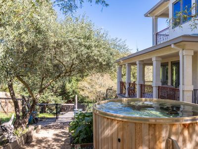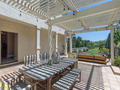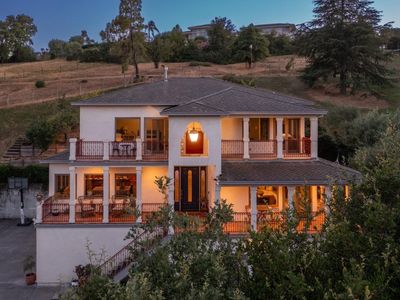 Beautiful Californian mission-style estate home. Presents a remarkable opportunity for those seeking a seamless blend of sophistication and functionality. Positioned privately down a long driveway, this residence embodies a unique combination of vision, thoughtful planning, and execution...offering all the conveniences of city living with a country vibe. Whether enjoying the multiple terraces, relishing the views, or taking in the aural beauty of birdsong from the large cedar hot tub, this estate offers a lifestyle of luxury and refinement, making it a truly exceptional offering in the market. Among its standout features is the sturdy steel beam framing ensuring structural integrity, while city services and the inclusion of a backup Generac generator speaks to the foresight invested in ensuring continuous comfort and convenience. The wine country style kitchen serves as the heart of the home, boasting upgraded materials such as classic pine cabinetry, high-end appliances including a Sub-Zero refrigerator, and Russian birch solid wood floors, opening on to a secluded outdoor eating and entertaining area. The thoughtful addition of a dumbwaiter streamlines the process of transporting groceries from the expansive 5-car garage, spanning over 1700 square feet.