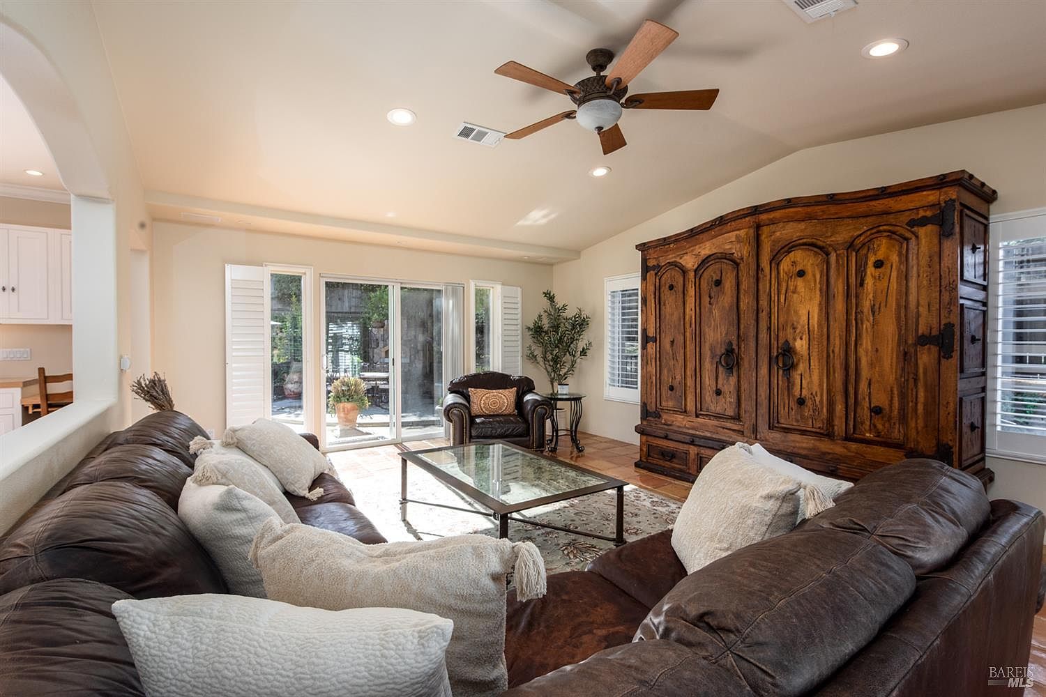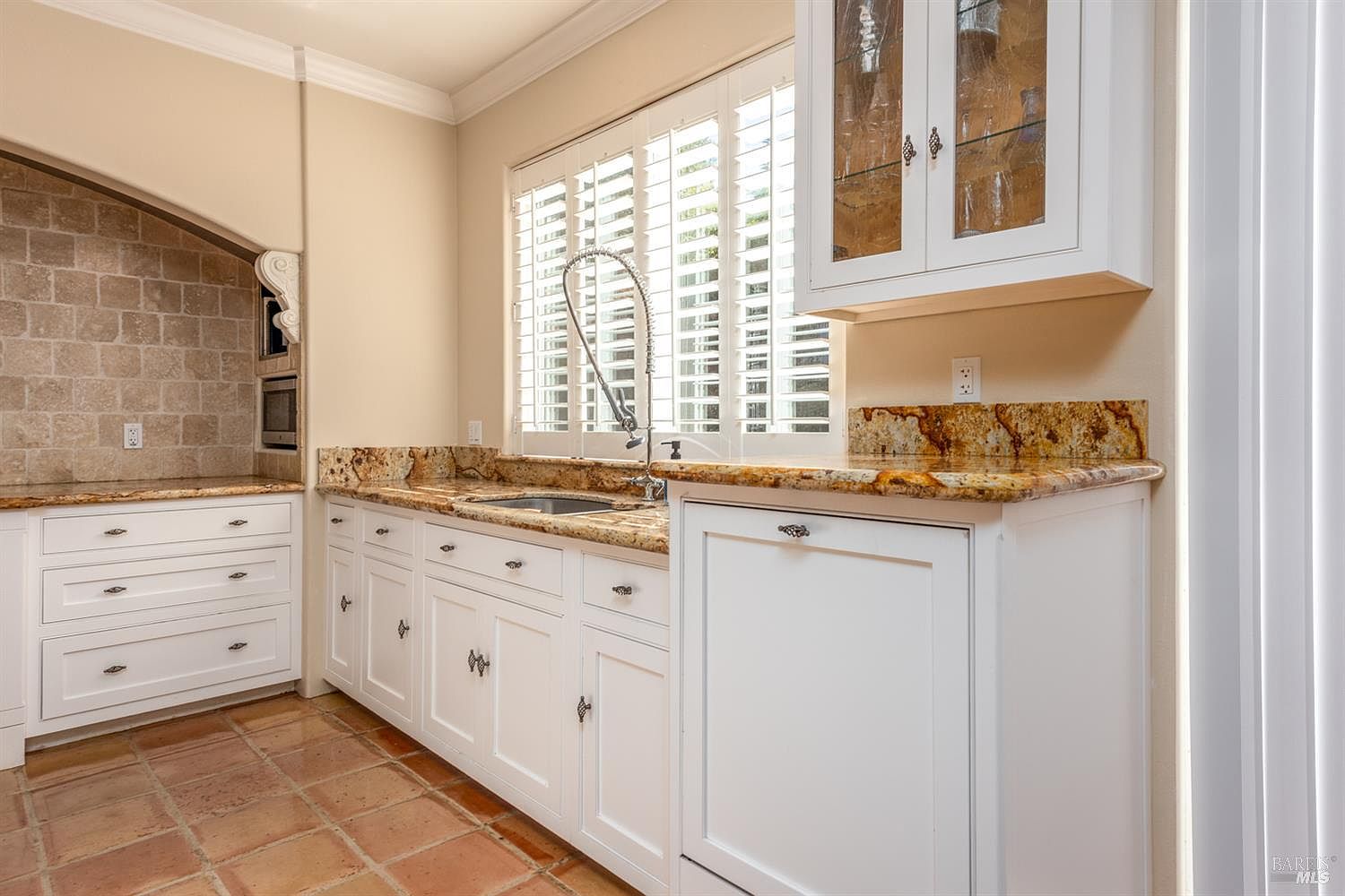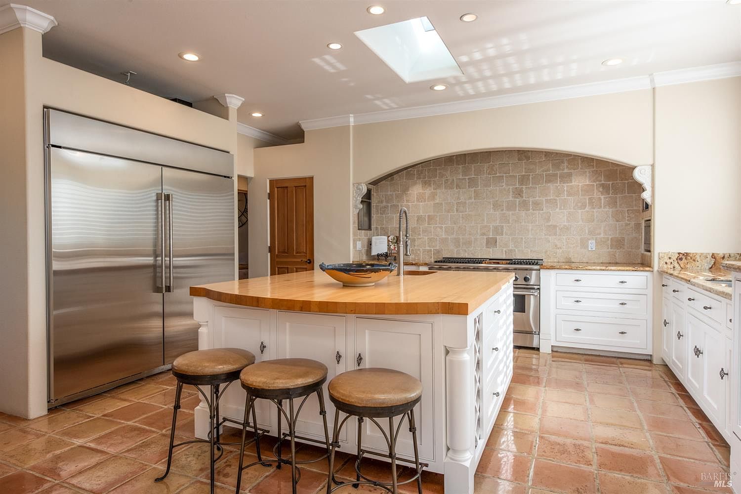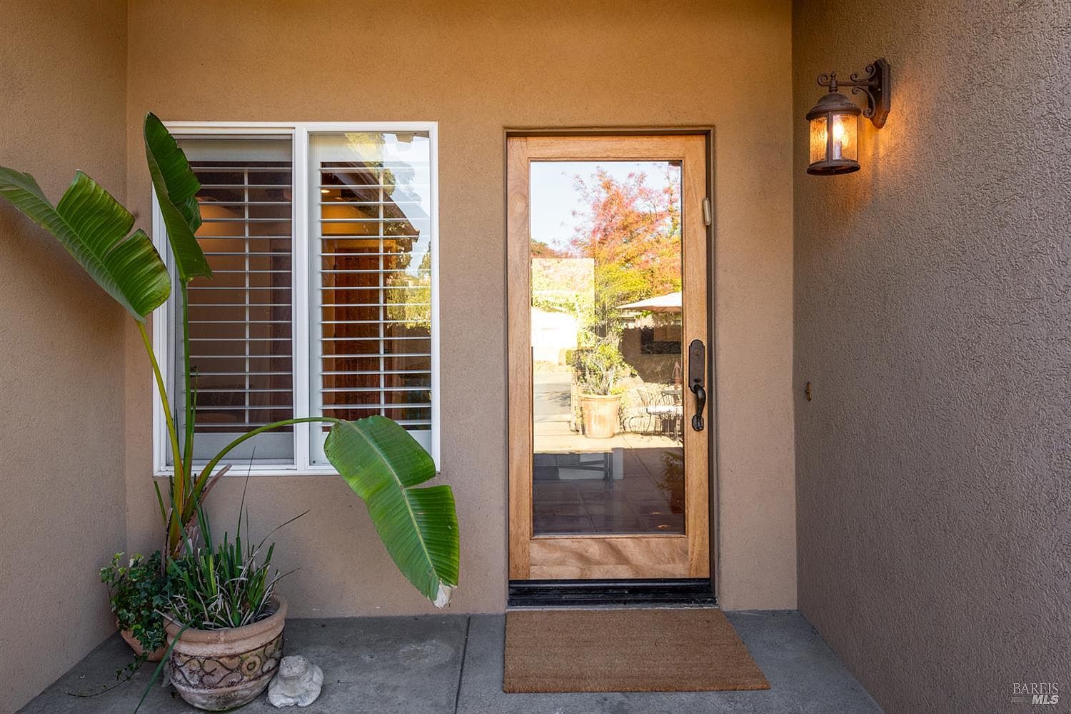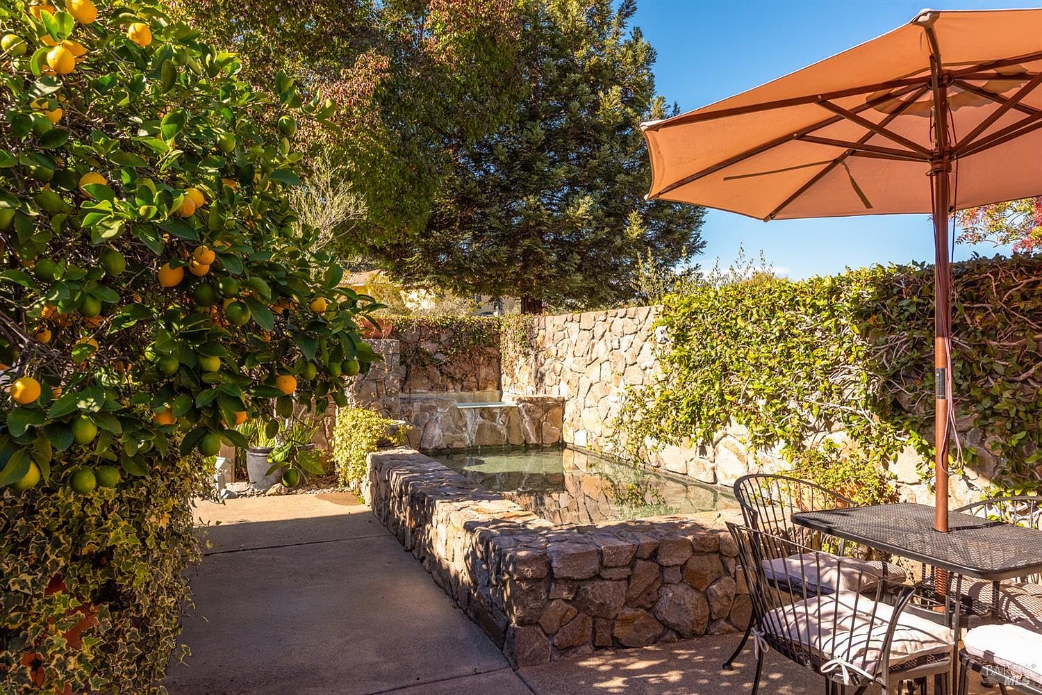 Light, bright, and designed for effortless entertaining, this single-level home offers the perfect blend of style and comfort. The open floor plan centers around a chef's kitchen featuring a Thermador professional 6-burner range with double ovens, commercial-size Monogram refrigerator and freezer, Bosch dishwasher, and a large island with prep sink. Custom cabinetry, plantation shutters throughout, and an oversized kitchen window with views of the backyard add to the home's inviting warmth. Enjoy seamless indoor-outdoor living with a backyard complete with an in-ground swimming pool, built-in BBQ, pizza oven, and children's playhouse. The tranquil front courtyard with water feature sets a welcoming tone, while the rock wall adds extra privacy. Spanish tile flooring flows throughout the home, complemented by an immaculate epoxy-finished garage and an abundance of mature fruit trees. A true Napa Valley retreat move-in ready and designed for everyday luxury.