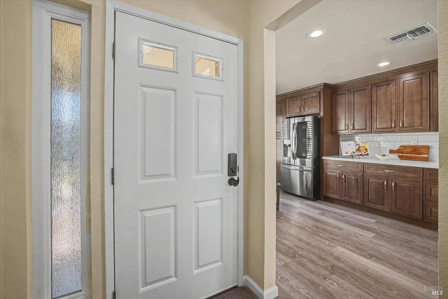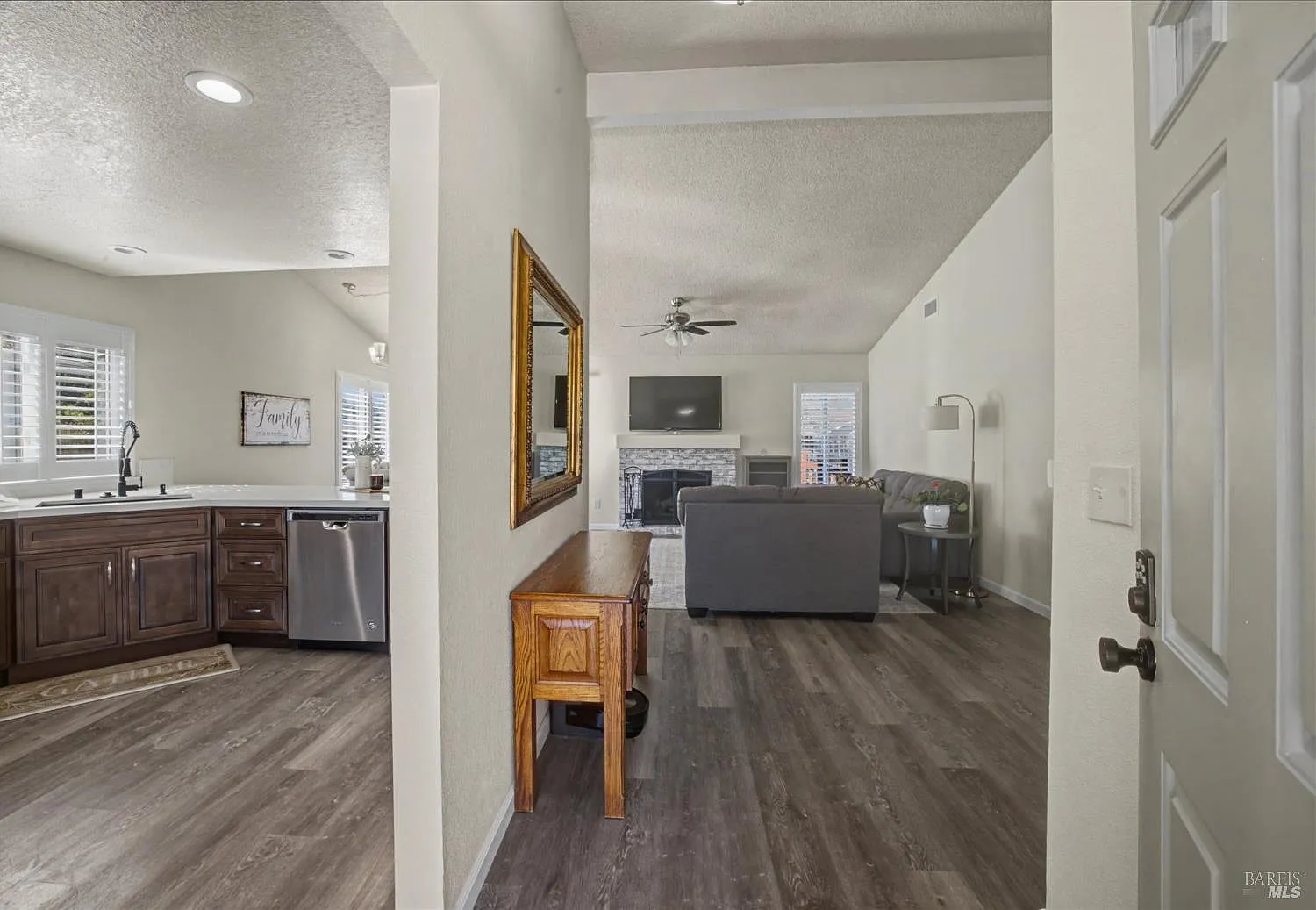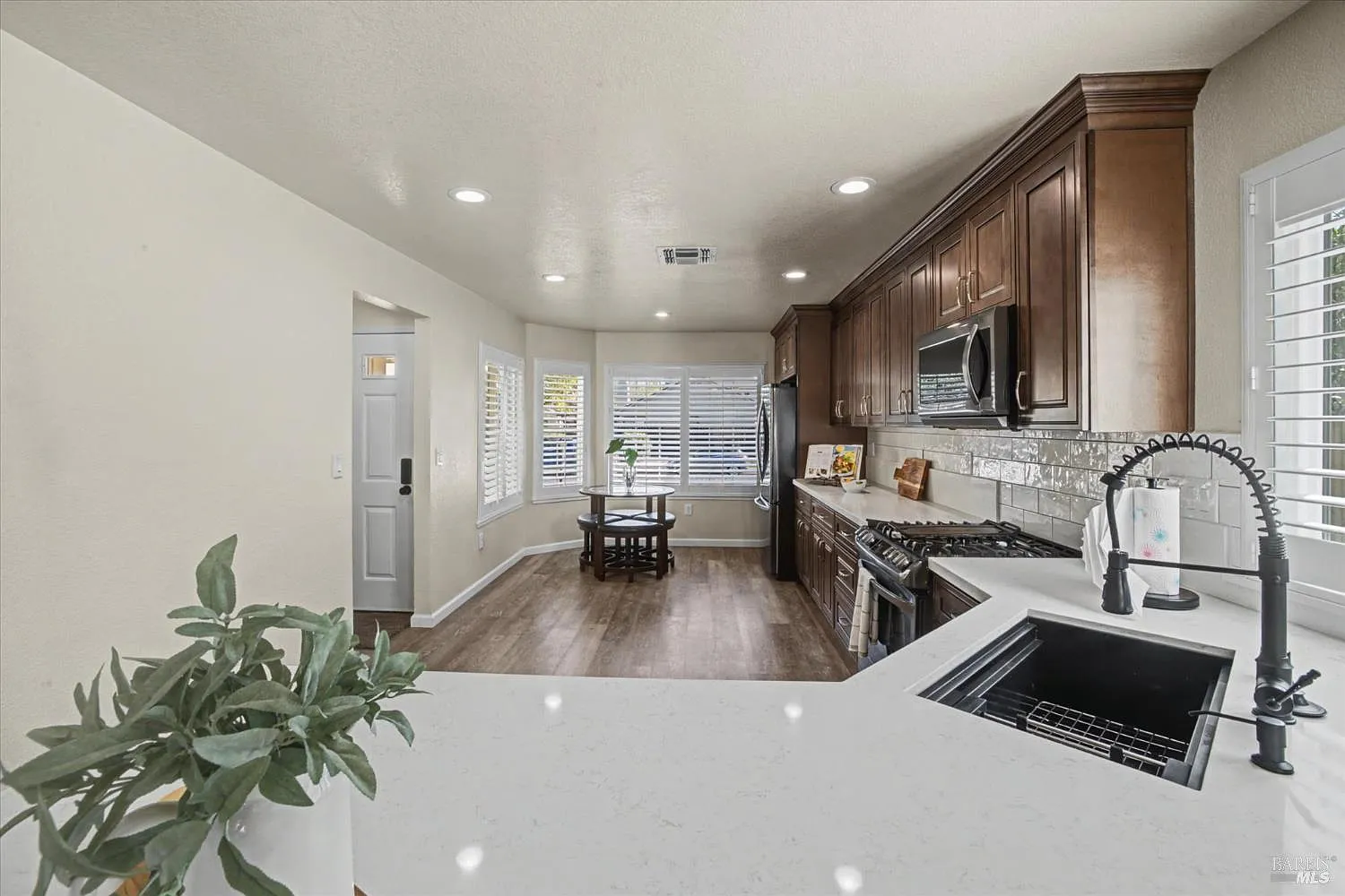 Beautifully remodeled 3-bedroom, 2-bath home offering approximately 1,379 sq ft on a spacious .1829-acre lot in desirable American Canyon. This move-in ready home blends modern upgrades with comfortable living. The remodeled kitchen features updated cabinetry, counters, subway tile backsplash, sink with garbage disposal, and a full suite of appliances including refrigerator, gas range, dishwasher, and microwave. Both bathrooms have been fully renovated with stylish finishes. Additional interior upgrades include dual-pane windows and sliding doors, shutters, updated HVAC system, new closet doors, updated door hardware, modern light fixtures, Ecobee smart thermostat, and replaced switches, and wall plates. The living room also features concealed TV wiring for a clean, modern look. Outdoor living is enhanced with new covered composite deck off the dining/living area and a second composite deck with railing off the primary bedroom. The backyard offers new landscaping with grass and sprinklers, a brick patio, storage shed, and multiple concrete patios and walkways including a side yard pad and gated entry. Front yard landscape is refreshed. The garage has installed cabinetry, updated entry doors, steps with handrail, and additional improvements including new gutters. Side yard has dog run or possible RV access. Ideally located within walking distance to the American Canyon Wetlands, schools, community pool, park, and local amenities. Situated on a rare one-block-long street, this home offers a quiet neighborhood feel while being part of the warm and welcoming community of American Canyon.