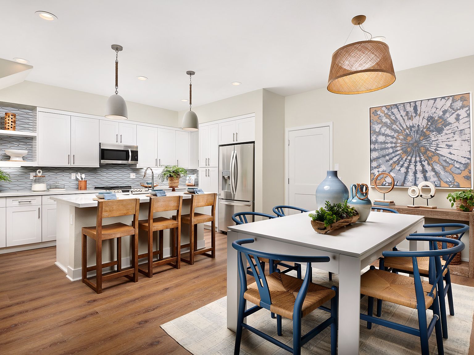 Our plan 1 features 3 bedrooms, open kitchen with spacious island, direct access garage, entry porch, dual vanities in the primary and secondary upstairs bathroom. Standard features include stainless kitchen appliances, quartz kitchen countertops, flat panel cabinetry with soft-close doors and drawers, NEST thermostat, keyless entry door hardware and more.