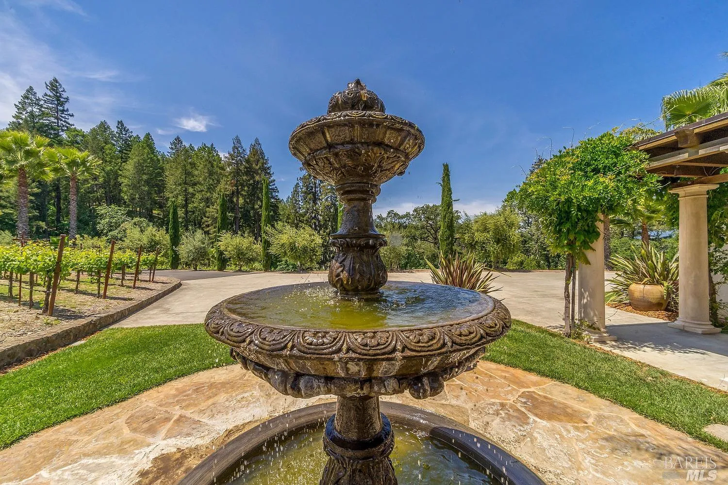 Sited on a sun-struck knoll on 18+ acres surrounded by prime Cabernet vineyards, this light-filled residence offers a wonderful sense of seclusion with 360' views in every direction. Architecture by the renowned Andrew Batey, whose designs were inspired by centuries of European classical rural architecture, emphasizes symmetry and simplicity. Possibly one of Andrew Batey's last creations, this home signals a bold new direction for modern wine-country living. French limestone floors span the main level; an artisan-carved limestone fireplace, masterfully crafted cabinetry, & custom-crafted metal railings, exotic lighting fixtures, & spacious primary suite with luxurious his & her baths & dressing rooms. The heart of the home is the magnificent kitchen with dramatic Cistercian ceiling arches influenced by the old abbeys of France, imported European Granite counters, Wolf range, Sub-zero, Bosch dishwasher, custom-crafted cabinets, & elegant touches throughout. Exquisitely landscaped grounds with a beautiful pond, verdant Palm trees, fruit orchards & excellent cash flow from 4 acres of prime Cabernet Sauvignon vineyard. Additionally, there is a 1,200 sq. ft. studio, custom wine cellar, and a productive 160 GPM commercial well for bountiful organic harvests.