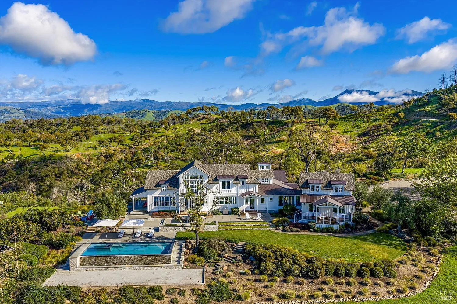Sited upon a naturally protected contour on 113 acres in one of Northern California's most desirable wine country settings, The Clearview Estate is a luxury vineyard estate near Healdsburg in Sonoma County, offering remarkable privacy, unobstructed sweeping views, and refined living in the heart of wine country. Just minutes from the Michelin-starred dining of Healdsburg, renowned wineries, and Sonoma County Airport, and approximately 1 hour from San Francisco, the property offers a rare balance of privacy and accessibility. The gently rolling landscape includes 7.5 acres of premium Cabernet Sauvignon vineyard under lease, offering the perks of vineyard ownership without the responsibilities of management. A five-mile trail network winds through open meadows, seasonal creeks, and around a tranquil reservoir below the residence, creating an exceptional setting for hiking, mountain biking, horseback riding, and exploring the natural beauty of the land. The 4,288 sq. ft. custom residence, built by respected wine country builder Total Concepts, reflects authentic farmhouse architecture with vaulted ceilings, expansive windows, and seamless indoor-outdoor living. The formal living room flows into the dining room with exposed beams and folding glass doors opening to outdoor spaces and a screened porch with fireplace. The kitchen features a generous butcher-block island, elevated appliance selection, walk-in pantry, and abundant windows framing the surrounding landscape. The entire second level is dedicated to the primary suite, offering vaulted ceilings, fireplace, multiple view balconies, spa-inspired bath with soaking tub, and dual walk-in closets. A private guest wing with its own living area, bedroom, sleeping loft, and covered porch provides comfortable accommodations for visitors. A temperature controlled wine cellar offers ample storage for collectors. Outdoor amenities include an infinity-edge pool and spa, bocce court, fire pit, and multiple gathering areas overlooking the property's inspiring landscape. Resting near converging creeks and heritage oaks, a distinctive party barn offers flexible space for a car collection, studio, workshop, or memorable gatherings. Grid-tied solar, multiple wells, water storage, and fenced pastureland complete this exceptional Healdsburg wine country estate. Experience a lifestyle defined by the land itself.