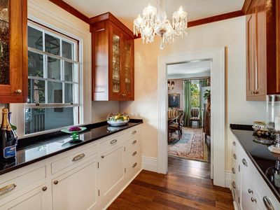 Upon entering you'll be greeted with expansive living areas that seamlessly integrate with a gourmet kitchen and butler's pantry, making it ideal for both entertaining and everyday living. High ceilings with original moldings, and large windows which flood the space with natural light highlight the elegant finishes and thoughtful design elements throughout. Fireplaces in the living room, dining room and kitchen add to the old world charm. The Primary suite is a true sanctuary, complete with a spacious ensuite bath and walk-in closet. The additional bedrooms, both with ensuite baths are generously sized, offering privacy and comfort. All bedrooms have exterior doors providing access to the second floor deck with garden views. Situated on a substantial 1/2 acre lot, the outdoor space is equally impressive, providing endless possibilities for gardening, recreation, or simply enjoying the beautiful Napa weather. Whether sitting on the first floor covered porch enjoying breakfast or sipping an evening beverage, hosting a summer BBQ from the outdoor kitchen, or a quite evening under the stars, this home caters to all your outdoor desires. Located in a welcoming neighborhood known for its peaceful ambiance this property provides easy access to Napa's vibrant downtown amenities.