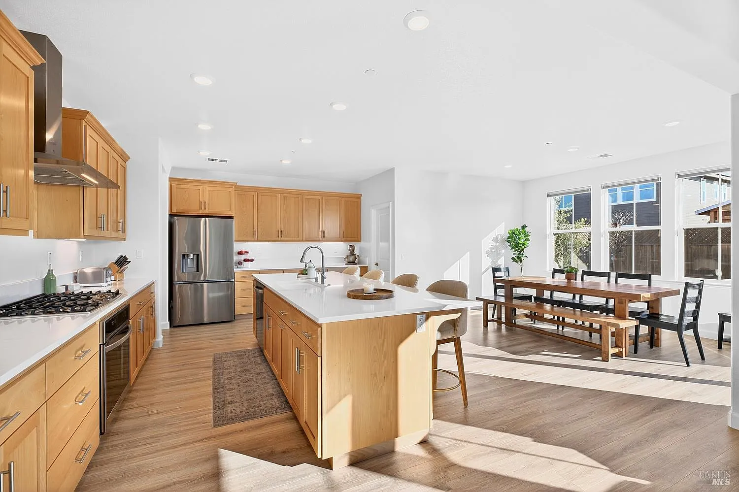 Welcome home to 7448 Wendy Drive! This beautifully appointed 4-bedroom (1 bedroom downstairs and 3 bedrooms upstairs), 3.5-bathroom, 2,549 square foot newer home (built in 2023) is located in Rohnert Park's desirable Willowglen Community. This home offers the perfect blend of comfort and modern living with a 5,050 square foot lot. Enjoy an open-concept layout flooded with natural light, perfect for entertaining. The entry level bedroom and full bathroom is ideal for guests, or the convenience of a home office (plus a half bath on the main level). Chefs will love the gourmet kitchen with an adjacent dining area, stainless steel appliances, 5-burner gas cooktop with hood and built-in oven below, quartz countertops, a large island with a sink and instant hot water, dishwasher, cabinet/drawer storage, bar seating, ample counter space and cabinetry, and a large walk-in pantry with an electrical outlet! Enjoy gatherings in the living room with a gas fireplace, raised heart and mantle. Enjoy views of the Sonoma Mountains from the primary suite, which features a soaking tub, separate shower, double sinks, walk-in closet with custom organizer with shelves, drawers, cabinets and ample hanger space. Other features include a laundry room with cabinets, heat-pump system for central A/C and heating, owned solar, tankless water heater, recessed lighting, Simply Safe alarm system, window coverings, water filtration system, and additional lighting in garage. Outdoor features included a covered front porch, paver patio, lawn area, privacy lattice fencing, dog run, and mature landscaping. Enjoy the Willowglen neighborhood park; featuring a playground, dog park, basketball court, soccer field, lawn areas, benches and tables. Close to parks, schools, shopping, restaurants, wineries, regional parks and trails, equestrian centers, Sonoma State University, Somo Village, Wolf Den Plaza, SMART train, Sonoma Coast, Russian River and all that Sonoma County has to offer! Whether you're a first-time homebuyer or looking to upgrade, this home is like new with over $110,000 in upgrades.