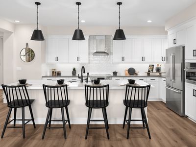 The plan 5, our largest features an open kitchen with large island, spacious dining room, great room with option to add a fireplace and 3 bedrooms. It also includes a den on the first floor and a loft on the second floor. Primary bedroom includes dual vanities and a large walk-in closet. Buyers may customize their home finishes by selecting countertops, tile, flooring and more.