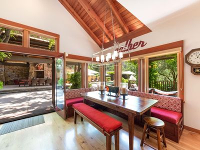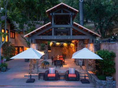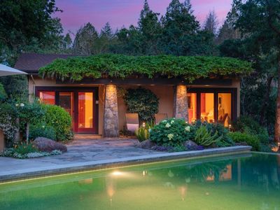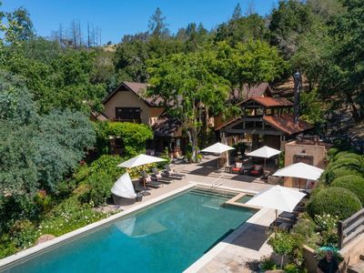 Welcome to Daisy Hill, a stunning retreat nestled in the serene beauty of St. Helena 2 miles from downtown and one mile from Meadowood Resort that sleeps up to 16 people. The main house with space for 12 and the two casitas for another 4! With its exquisite craftsmanship, breathtaking landscapes designed by Johnathan Plant, and luxurious amenities, it offers an unparalleled experience for those seeking a tranquil and private haven just minutes from shopping and dining. Sited on a bucolic country lane and originally custom-built in 2001, the two-story Craftsman-style home of stucco and wood siding showcases its timeless elegance. Designed for an elevated style of family living and entertaining, Daisy Hill includes the primary residence with 4 bedrooms, 4.5 baths, an outdoor dining pavilion and kitchen, a parlor/gym with a full bath, two guest casitas ensuite with private entrances, a pool with waterfall edge, bocce ball court, lighting and sound throughout, walking trails and seemingly endless, mature, lush gardens and tranquil nooks. Heavenly retreat.