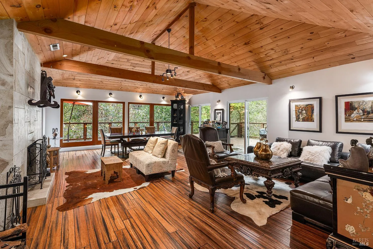 Beautifully updated and tranquil, this four-bedroom, three-and-a-half-bath retreat sits just steps from downtown Occidentalyet feels worlds away. Tucked amid towering redwoods beside a peaceful year-round creek, the property offers the quintessential Sonoma Wine Country lifestyle: serene, nature-framed living and proximity to artisan shops, acclaimed cafes, and the vibrant creative spirit that defines this beloved Bohemian enclave. Breathtaking views of forest and sky surround the residence, with expansive wraparound decks on both the upper and lower levels creating seamless indoor-outdoor living. Hardwood floors flow throughout, complemented by soaring vaulted open-beam wood ceilings and a cozy wood-burning fireplace, bringing warmth, natural light, and rustic sophistication to each room. The modern kitchencomplete with stainless steel appliancesopens through wide sliding glass doors to the decks, allowing the beauty of the outdoors to spill gracefully inside. Thoughtful updates and finishes elevate the home while preserving its inviting, organic character. Designed for exceptional versatility, the property offers two distinct living spaces: a 2-bedroom, 1.5-bath haven upstairs and a 2-bedroom, 2-bath retreat below. Enjoy the home as one spacious residence or use it as independent quartersperfect for multi-generational living, guests, or private workspaces. Beyond the doorstep lies the best of the region. Just minutes away you'll find the iconic Russian River for kayaking, swimming, paddling, and forest hikes; vineyard-lined country roads leading to world-class wineries in Freestone, Graton, and Sebastopol; and a culinary landscape that spans from Occidental's historic dining institutions to boutique tasting menus and farm-driven eateries. And within a scenic 20-minute drive, the windswept cliffs, beaches, and oyster shacks of Bodega Bay and the Sonoma Coast await. Offering privacy, beauty, convenience, and the magic of redwoods, river, and coastthis is Wine Country living at its most enchanting.