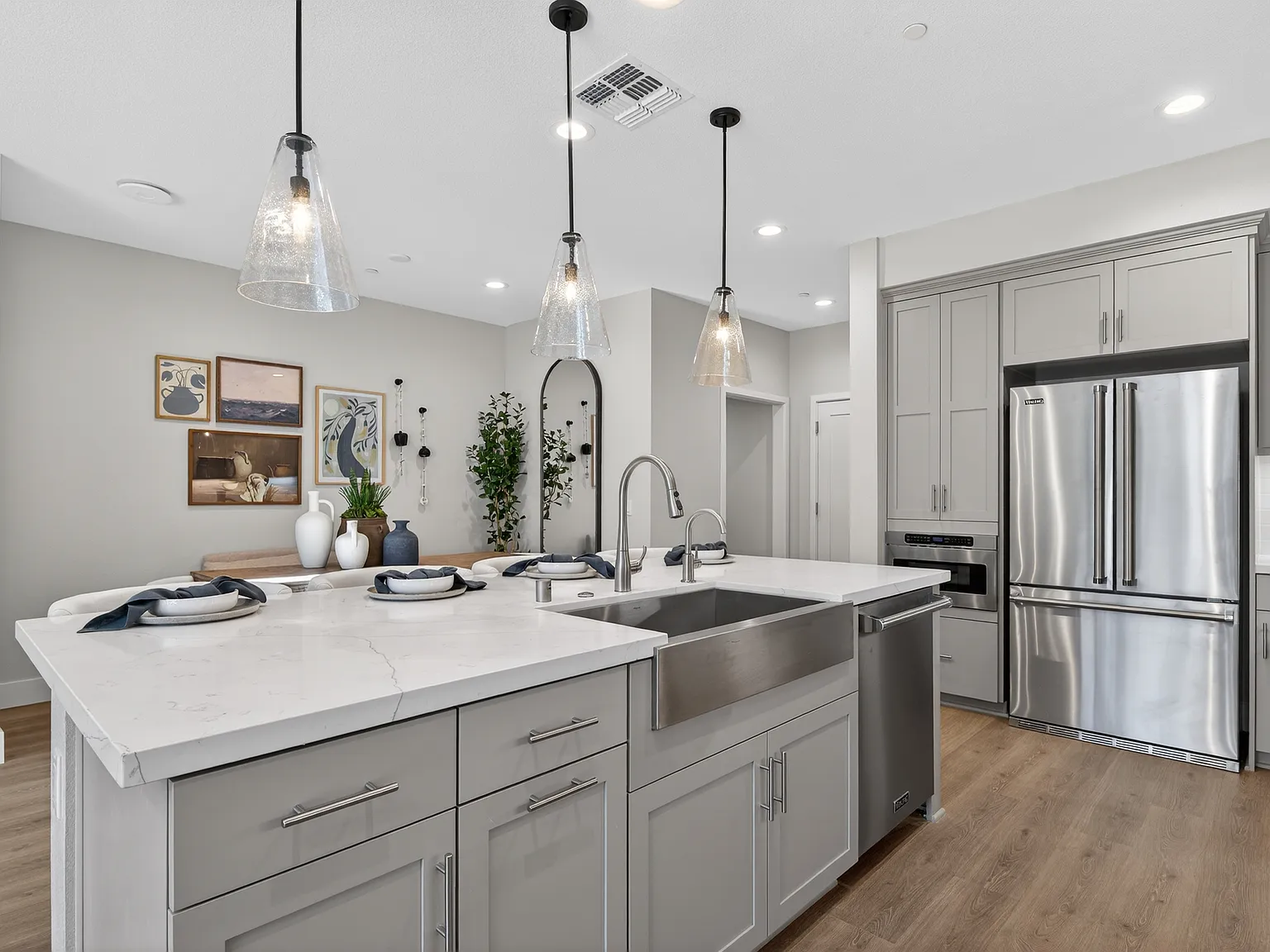 This two-story home offers a practical and well-organized layout with a comfortable balance of shared and private spaces. The main living area features an open flow between the living room, dining room, and kitchen, creating an inviting setting for everyday living and entertaining. The kitchen includes an island, ample counter space, and convenient access to storage, while a nearby powder room adds everyday functionality. A covered porch and a spacious two-car garage complete the main level. Upstairs, the home provides a private retreat with a generously sized primary bedroom featuring a walk-in closet and an en-suite bathroom. Two additional bedrooms are thoughtfully positioned near a full bathroom, while a central loft offers flexible space for a media room, home office, or play area. A dedicated laundry area and additional storage enhance convenience, making this floorplan both efficient and comfortable.