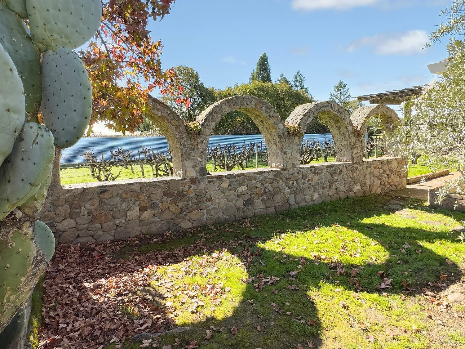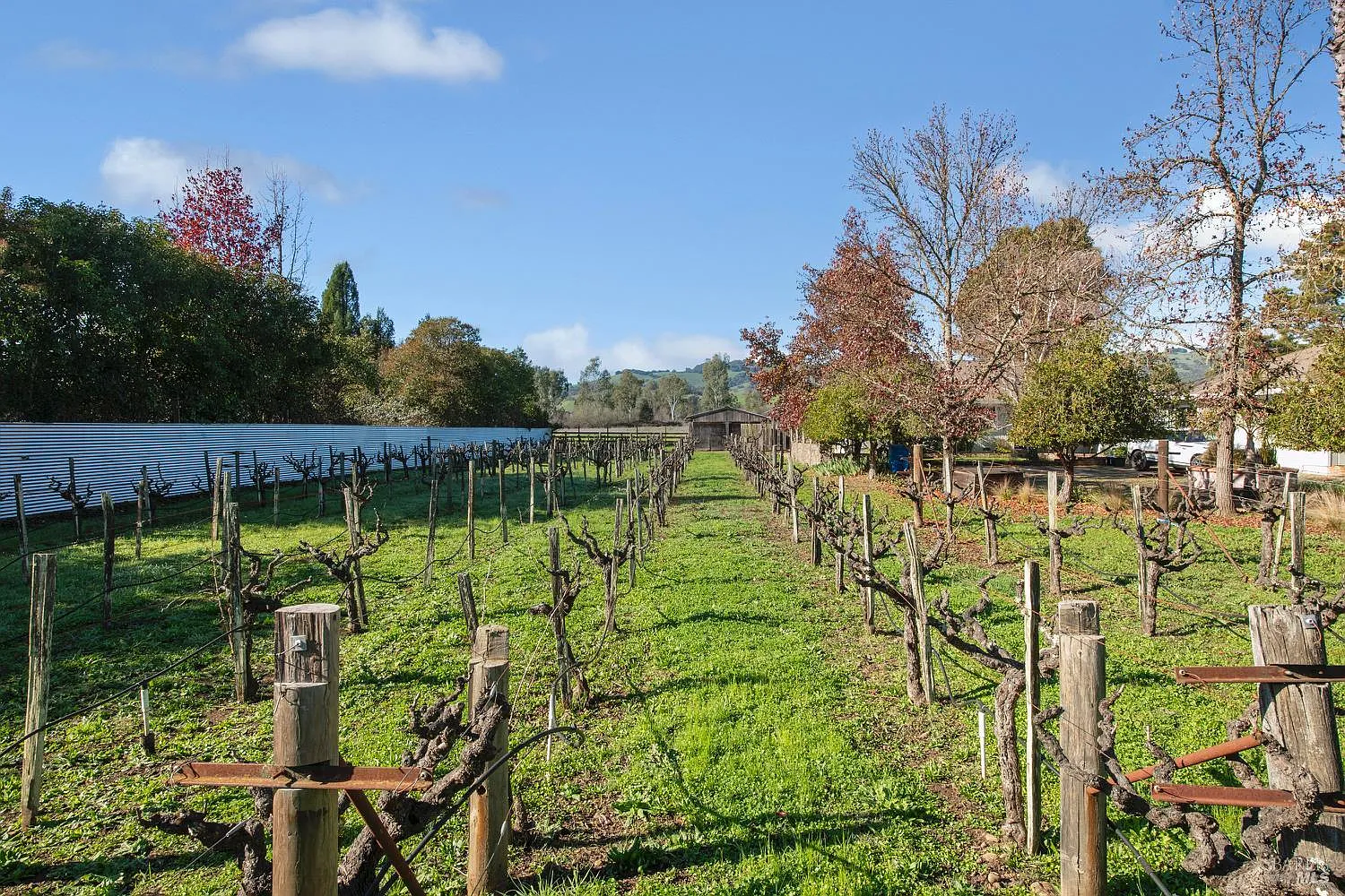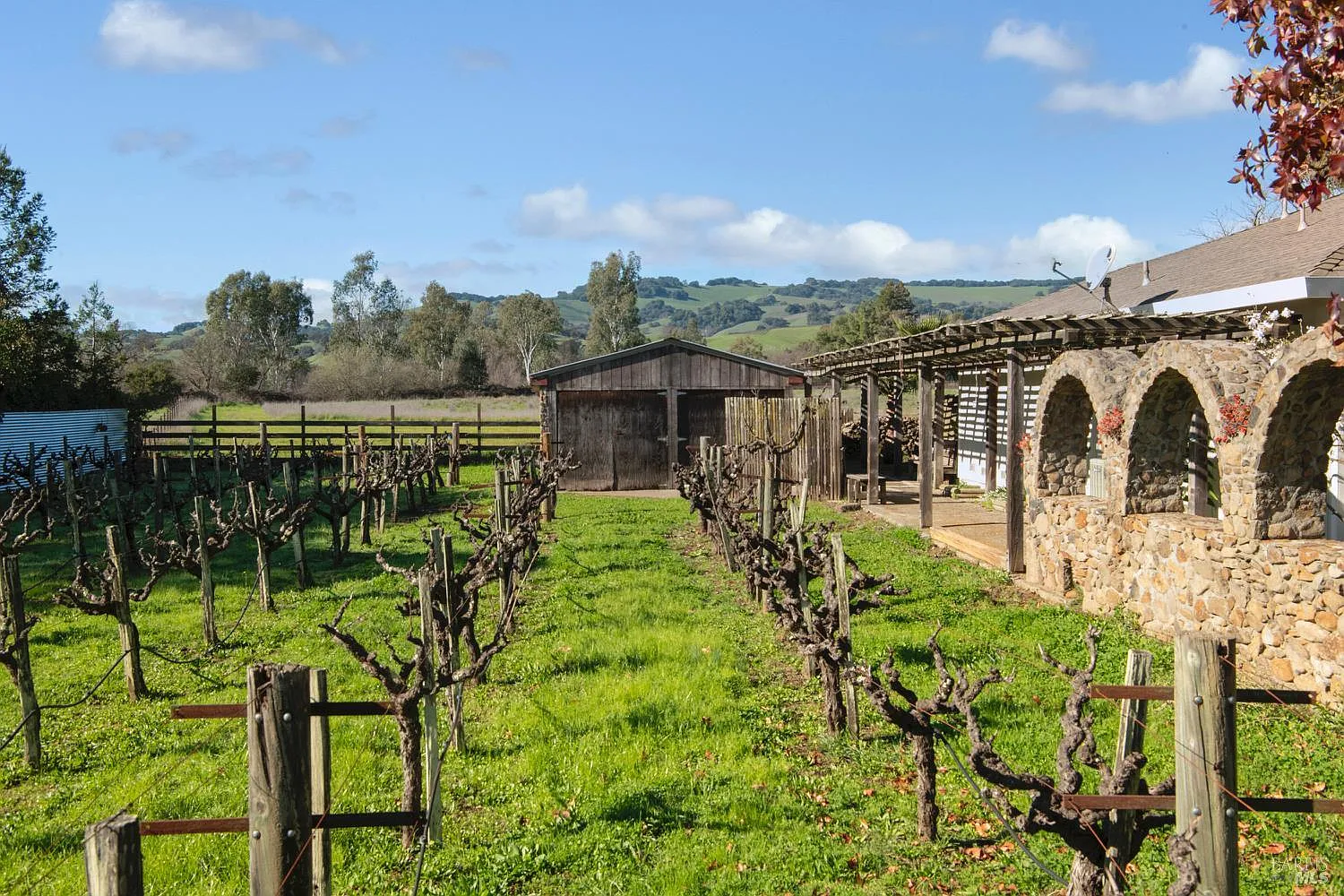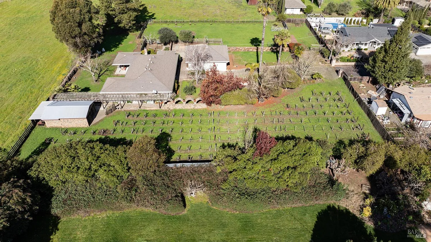 Ranch-style home on over one acre of land in private setting with views of open space and mountains! The old-vine gentleman's boutique vineyard adds to the charm. This 4-bedroom, 2-bath single story home enjoys bright and sunny interiors and a versatile floor plan that includes eat-in kitchen, formal dining room or office, living room with beautiful mountain views and a family room off the kitchen with a cozy wood stove--An inviting space with access to covered patio perfect for indoor-outdoor living with plenty of space for pool or other outdoor recreation. The detached garage offers added flexibility with a separate art studio or a private workspace, ideal for creative pursuits or workshop. In addition to garage and covered patio, property includes a wine storage barn, small pasture for a horse, garden, and mature picturesque landscaping. It is tucked away at the end of private lane in a highly desirable west-side location, offering a convenient commute while maintaining a peaceful country setting.