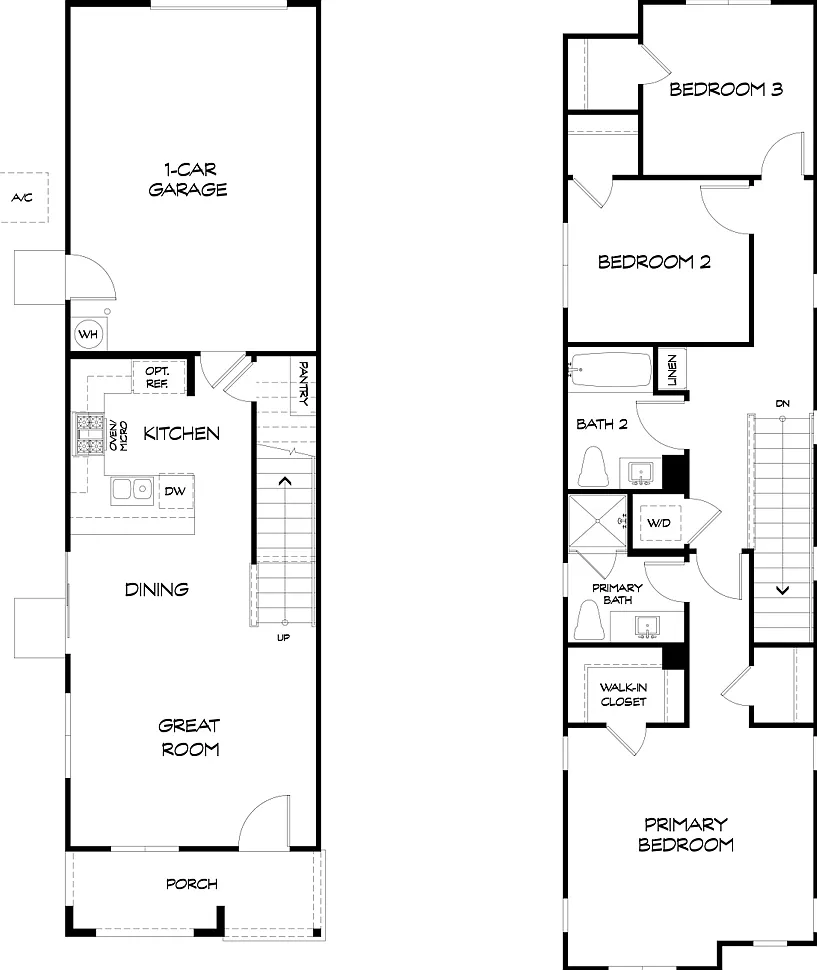 This thoughtfully designed 1,230-square-foot two-story home offers a smart, efficient layout that maximizes both comfort and functionality. The main level features a welcoming front porch that opens into a spacious great room, flowing seamlessly into the dining area and a well-appointed kitchen complete with pantry and convenient access to the attached one-car garage. Upstairs, all bedrooms are privately situated, including a comfortable primary suite with its own walk-in closet and en-suite bath, along with two additional bedrooms and a full secondary bathroom. A centrally located laundry area adds everyday convenience, while the efficient staircase placement enhances the natural flow between levels, making this home an ideal blend of practicality and modern living.