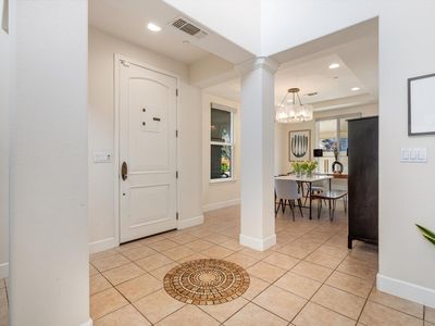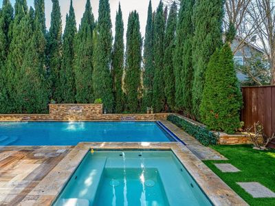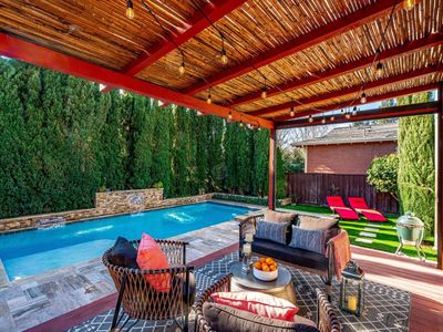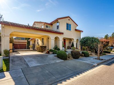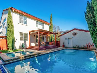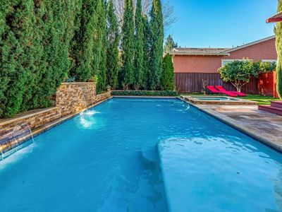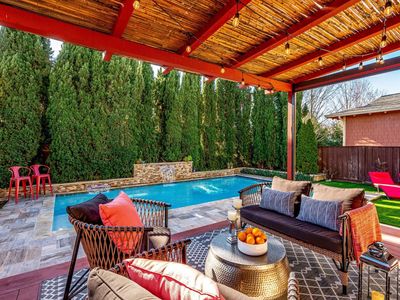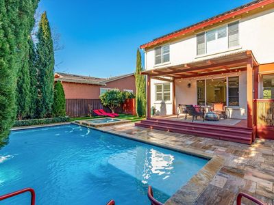 Experience the ultimate blend of comfort, sophistication, and resort-style living in this stunning Eastside Sonoma retreat. Designed for both relaxation and entertaining, the private backyard is a true oasis featuring a sparkling swimming pool with waterfalls and jacuzzi, surrounded by lush landscaping, olive and citrus trees, vegetable beds, and towering cypress that provide exceptional privacy. Inside, a thoughtfully designed floor plan welcomes you with a formal entry and dining room, flowing seamlessly into an open kitchen and living area. The living room, anchored by a gas fireplace, opens to a covered rear deck overlooking the serene garden and pool - perfect for indoor-outdoor living. The chef's kitchen offers a central island and stainless steel appliances, ideal for gatherings large and small. The main level includes a bedroom and full bathroom, while the upper level hosts a luxurious primary suite with a custom walk-in closet and built-in shelving, along with two additional bedrooms, a full bath, and a laundry room. Modern comforts abound with dual-zone central heat and air, a tankless water heater, and fully paid solar. A detached garage and gated porte cochere provide ample parking and added security with possibilities for a future ADU conversion. With summer just around the corner, this exceptional Eastside Sonoma home is ready to elevate your lifestyle and fill your days with sunshine.