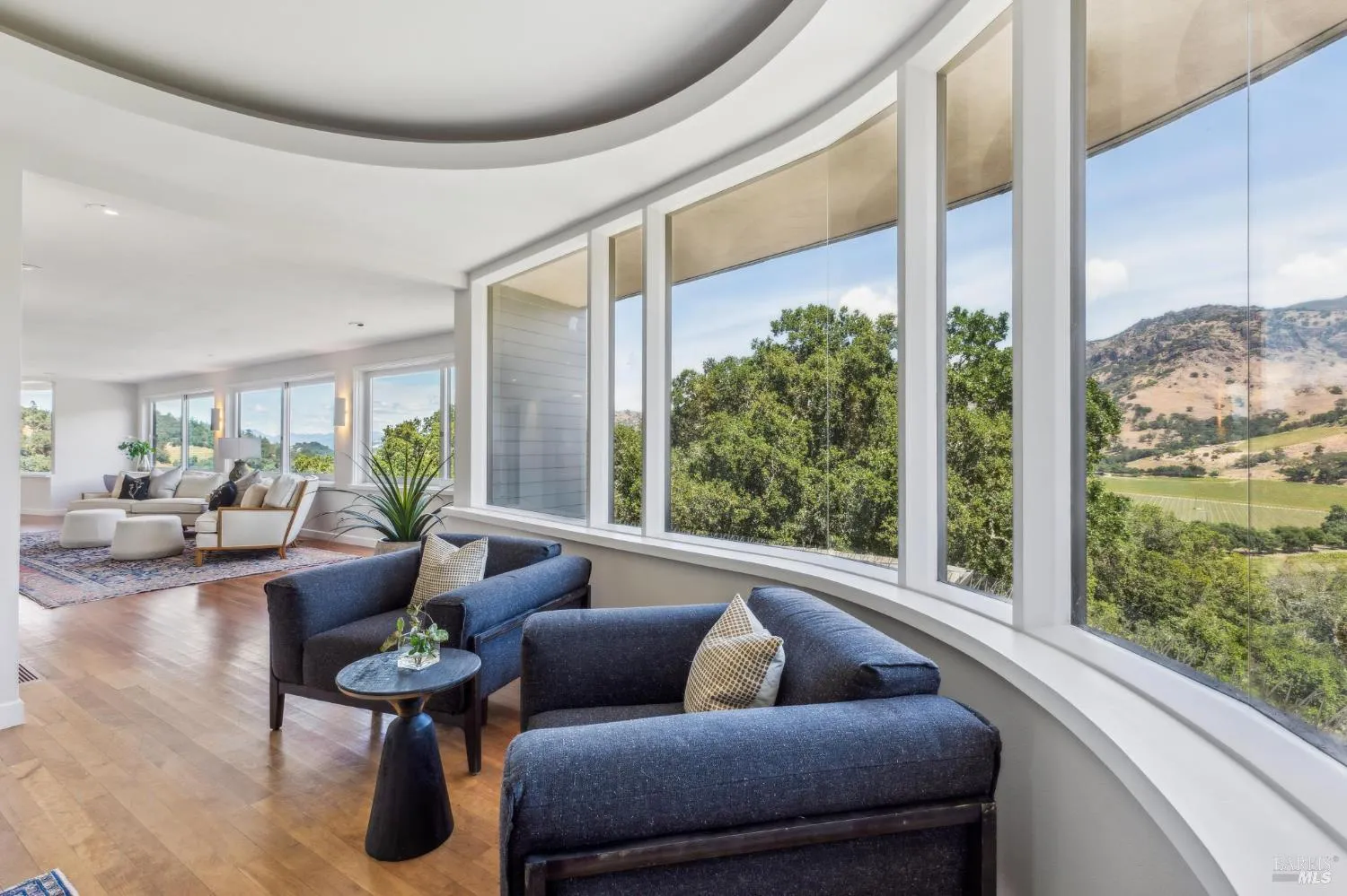 The incredible legacy of this estate will capture your imagination, while the beauty of the setting and the style and comfort of the home will capture your heart. Perched atop a knoll and anchored in bedrock, this 7,912 SF, 6-bedroom home commands views of Napa Valley with Stags Leap Palisades as the backdrop. Designed to take in the ever-changing light on the peaks, the home blends strength and artistry with restrained elegance. The glass-paneled doors open to amber wood floors and a gallery of windows. The warm bookshelf lined library is tucked down the hall, while the living room with open beams, stone fireplace, built-ins and hidden glass doors that partition it from the window gallery, then flows seamlessly to the bar & dining room with gorgeous views. The chef's kitchen features butcher block counters, a six-burner Wolf range, skylight, and is open to the family room. The west-facing primary suite offers a marble bath, deep soaking tub, and spacious dressing room. The lower level includes a former dance studio, additional bed & bath, woodworking shop, wine cellar, and guest suite with its own outside patio. Upstairs, three charming bedrooms feel like a secret retreat. Surrounded by gardens, and heritage oaks this 8.19 acres is history waiting to be loved and reimagined.